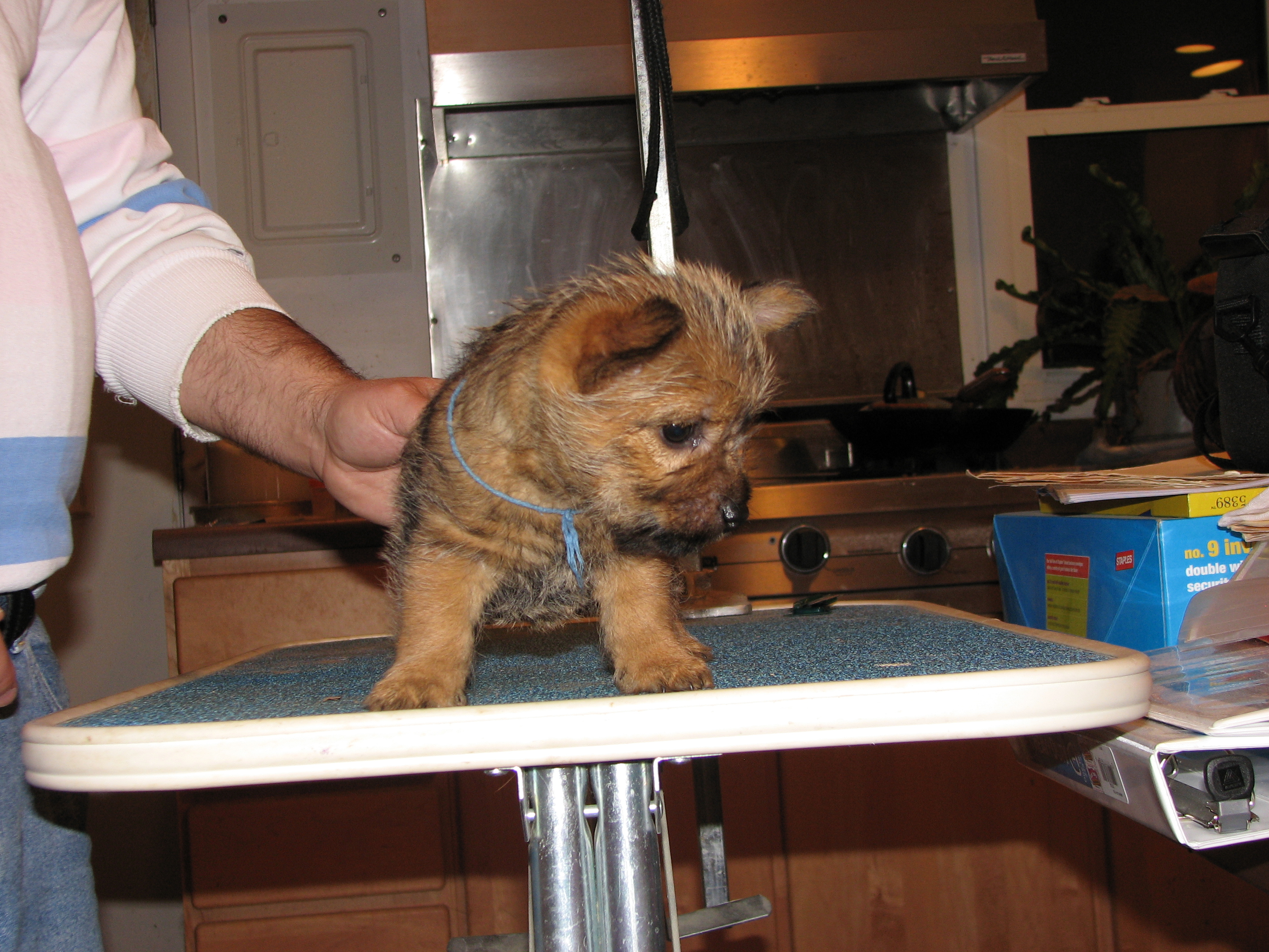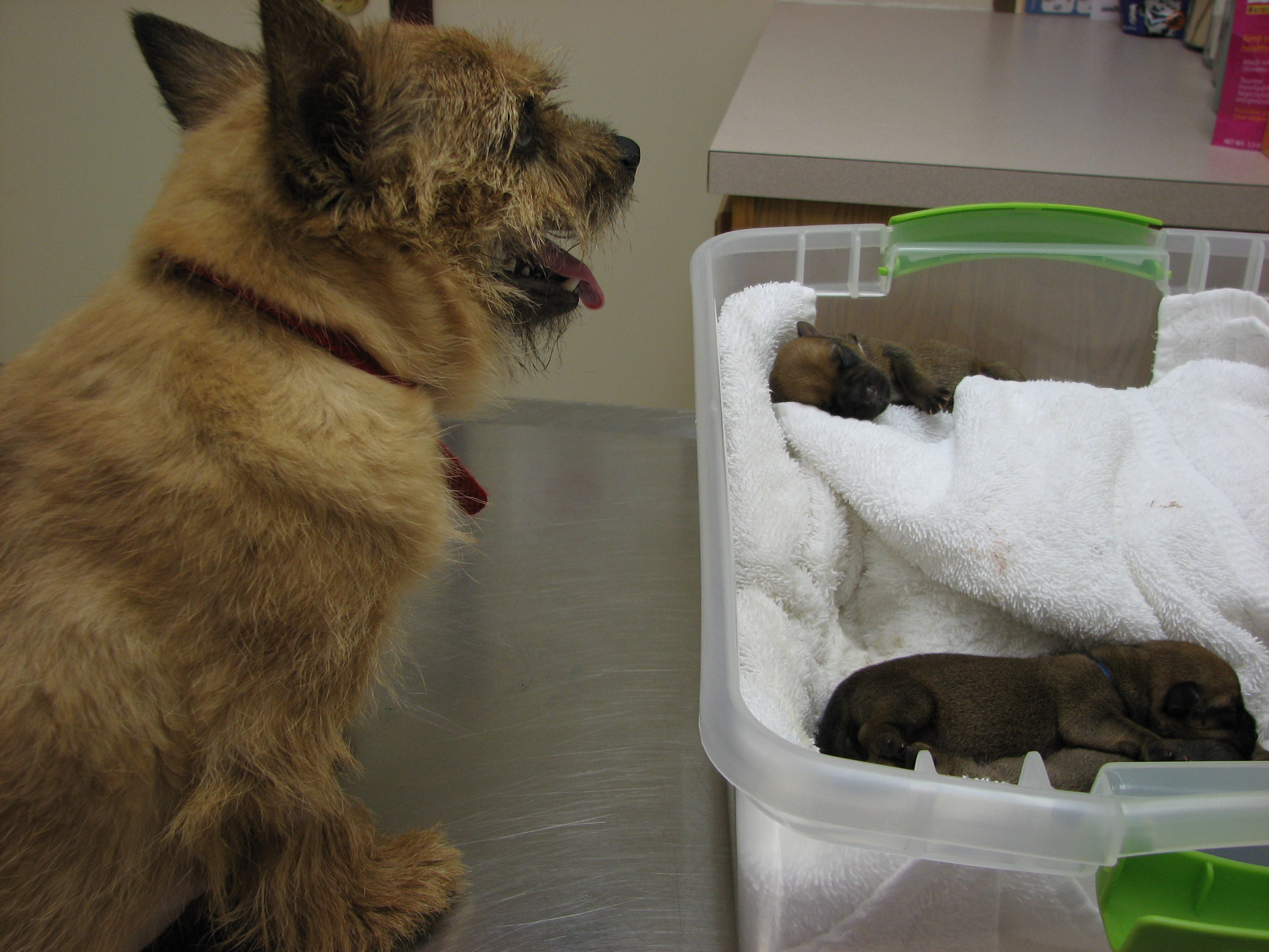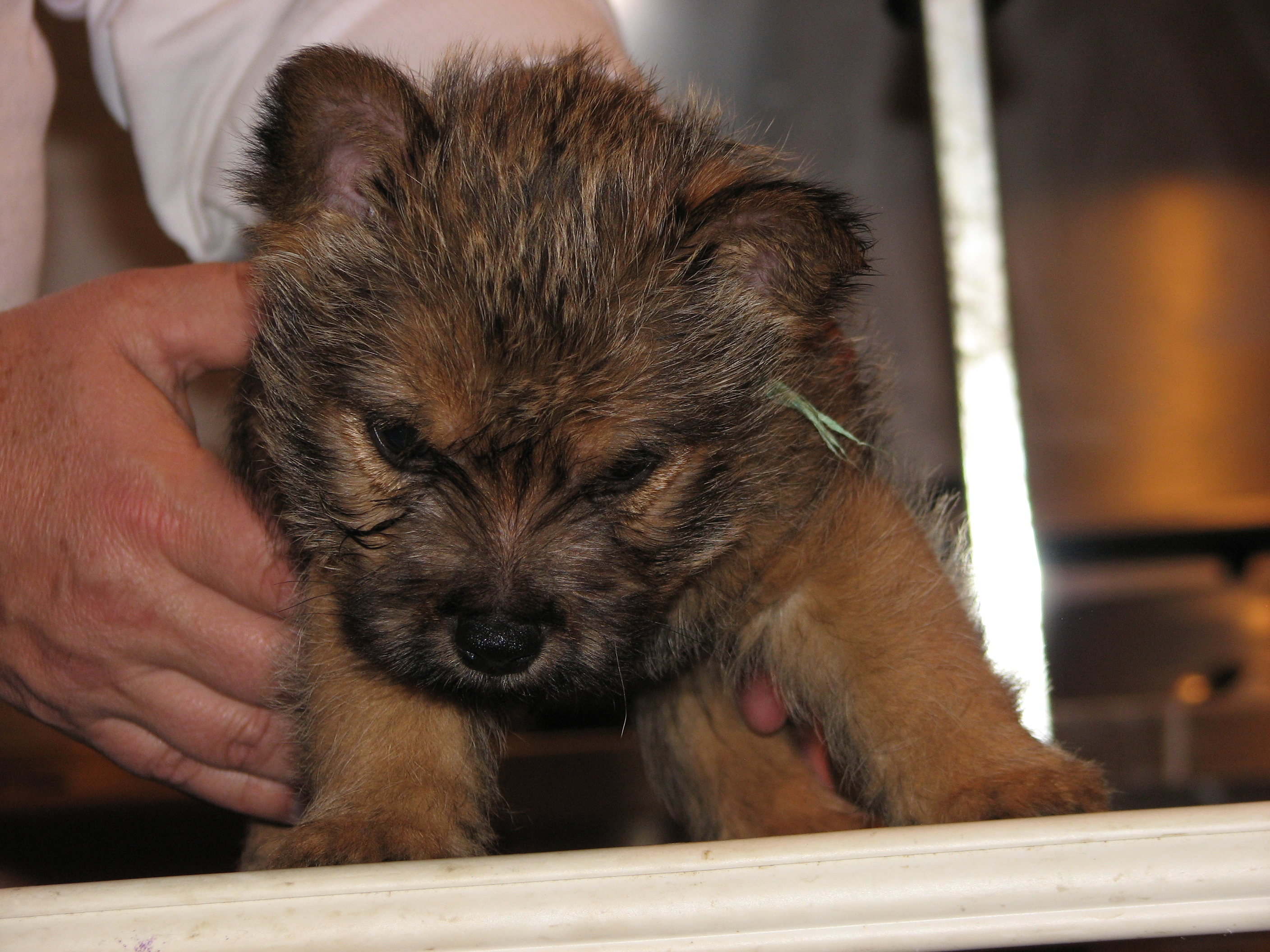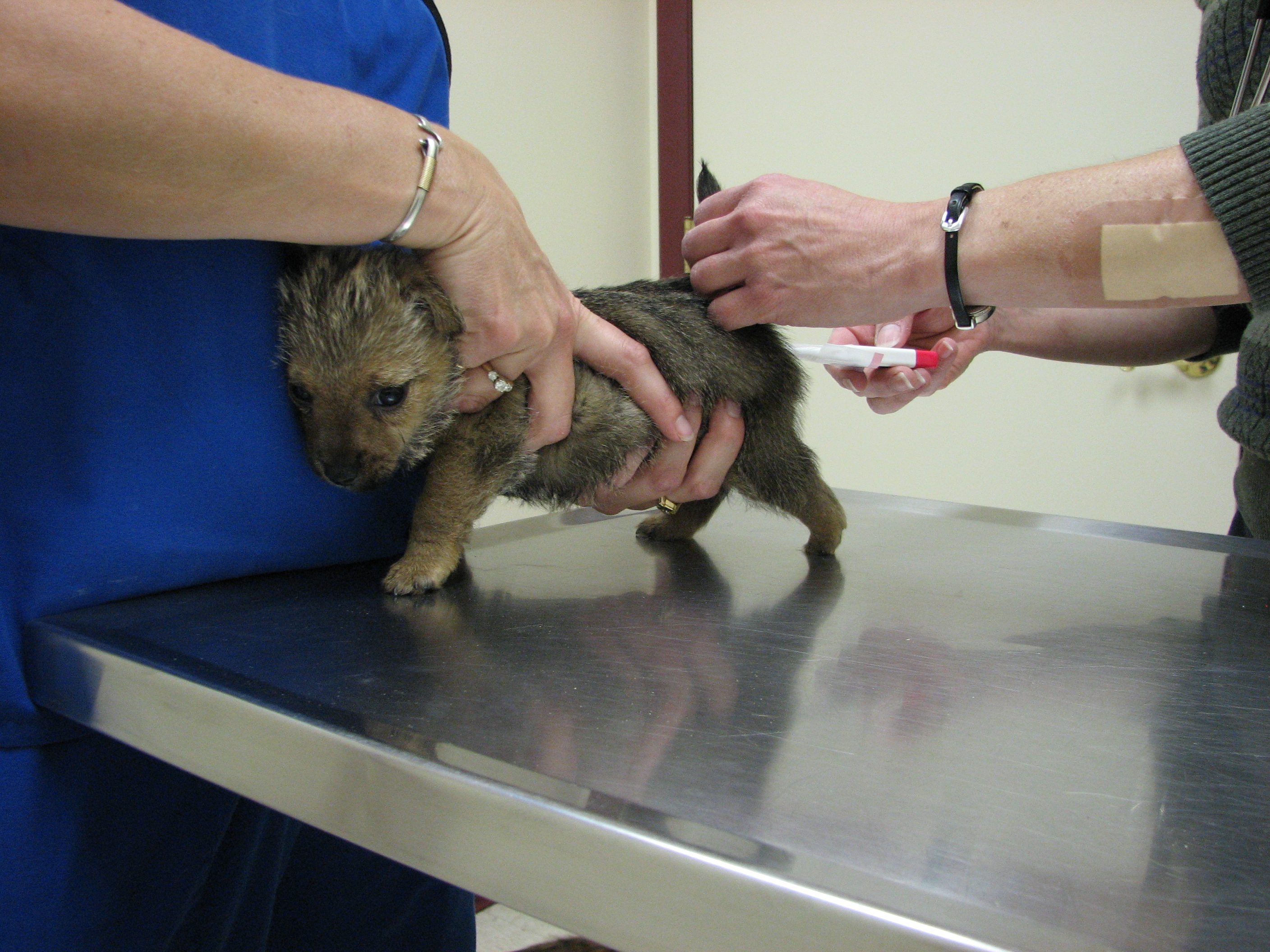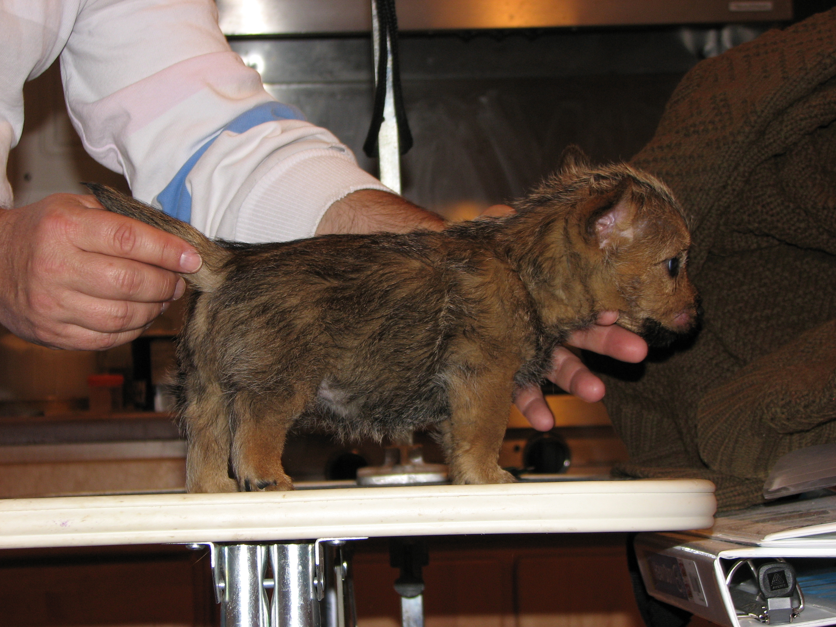 The puppies first visit to the vet. In spite of the hot water