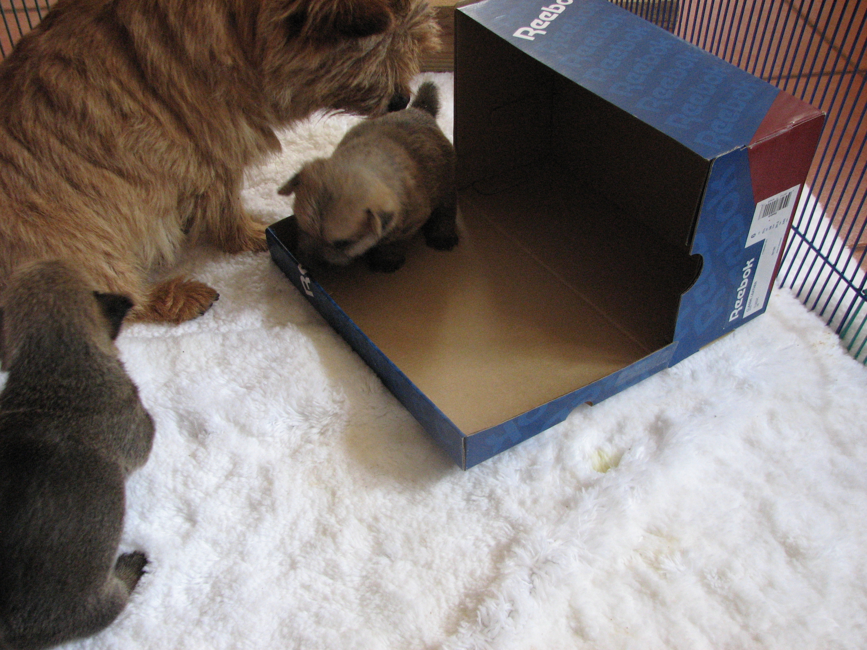 - Puppies investigating Mandy's crate.