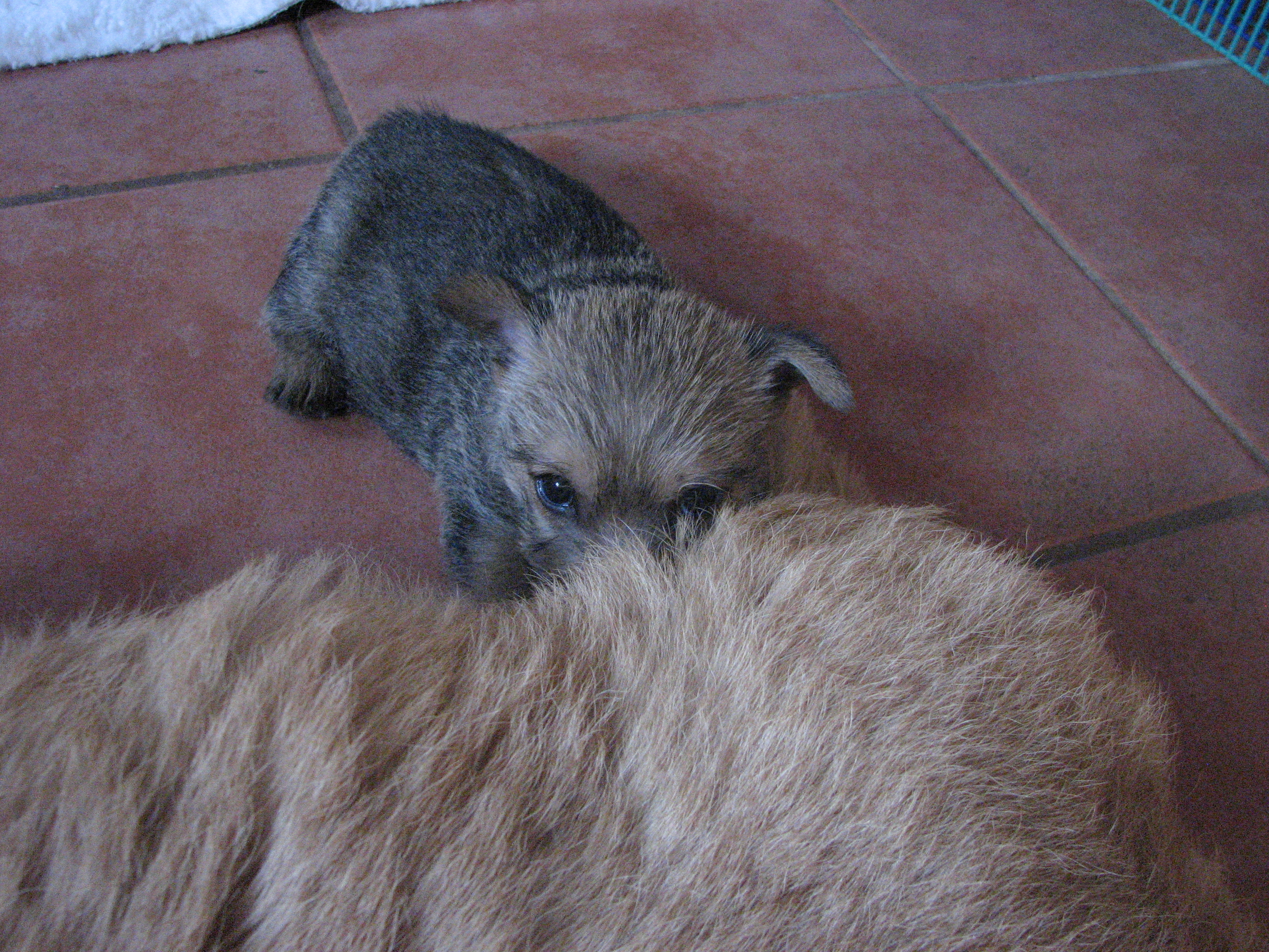 - Puppies pulling on mommy's fur.