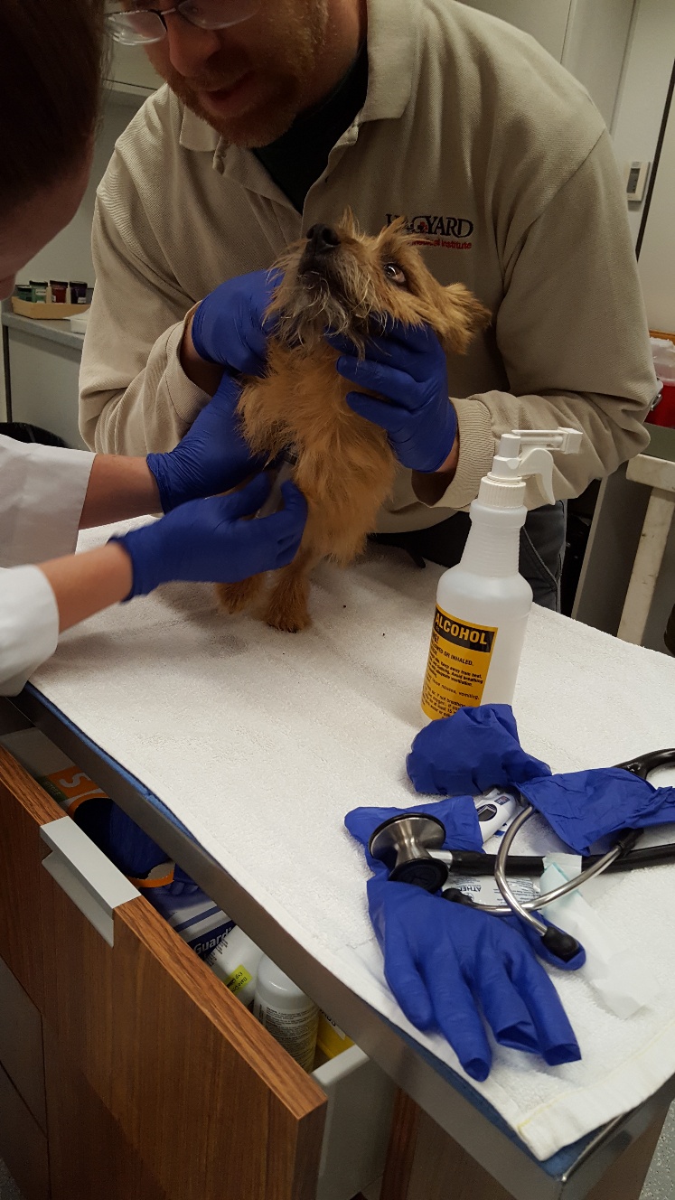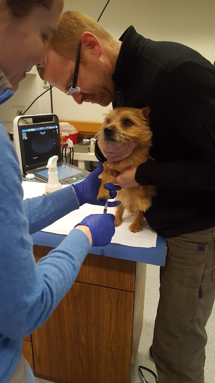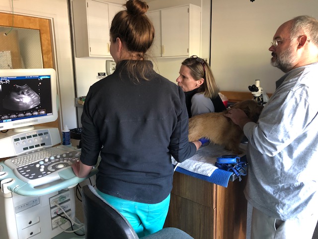 I actually had to take Mandy outside shortly afterwards as Bentley was just getting so worked up and frustrated. We tried to let Mandy and Bentley breed naturally (with Dr. Stora's assistance), but Bentley was unable to make a tie. So Dr. Stora did an AI. (Think "turkey baster".)