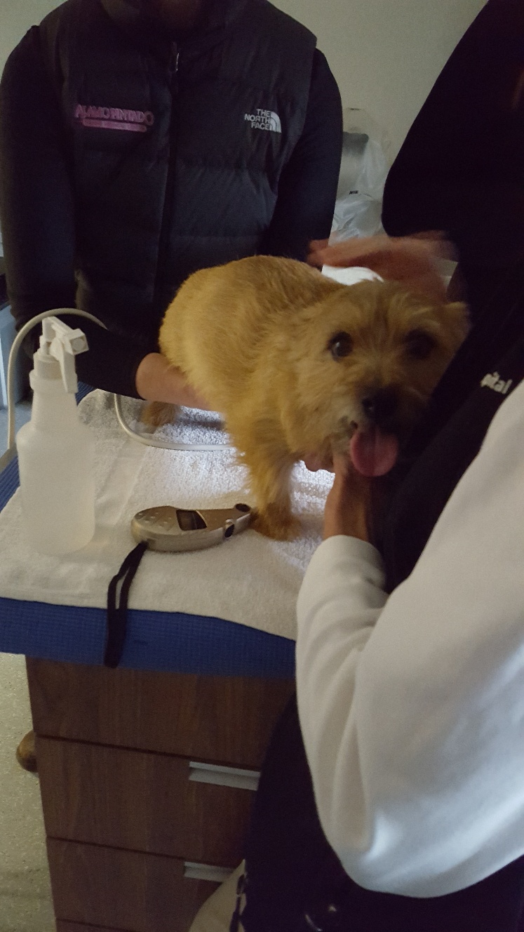 Around 11 am I got a phone call informing me that Mandy would be having her c-section starting at 1:30 pm, and asking that I be in the waiting room at that time in case they needed to consult with me. Around 1:50 pm, one of the vets came out and told me that the puppy was a girl, that both Mandy and puppy were doing find, and that they were just closing Mandy up.