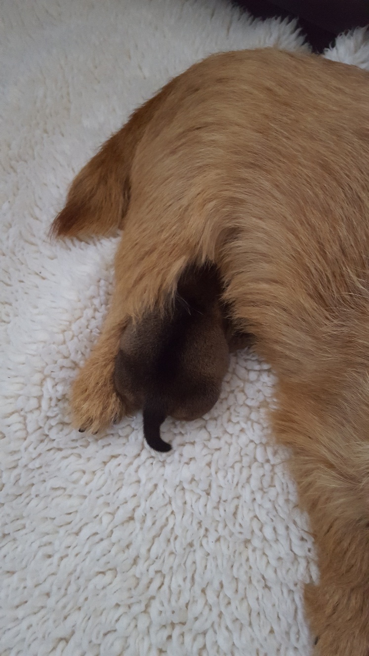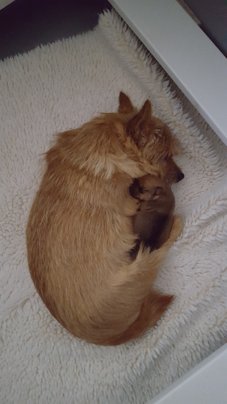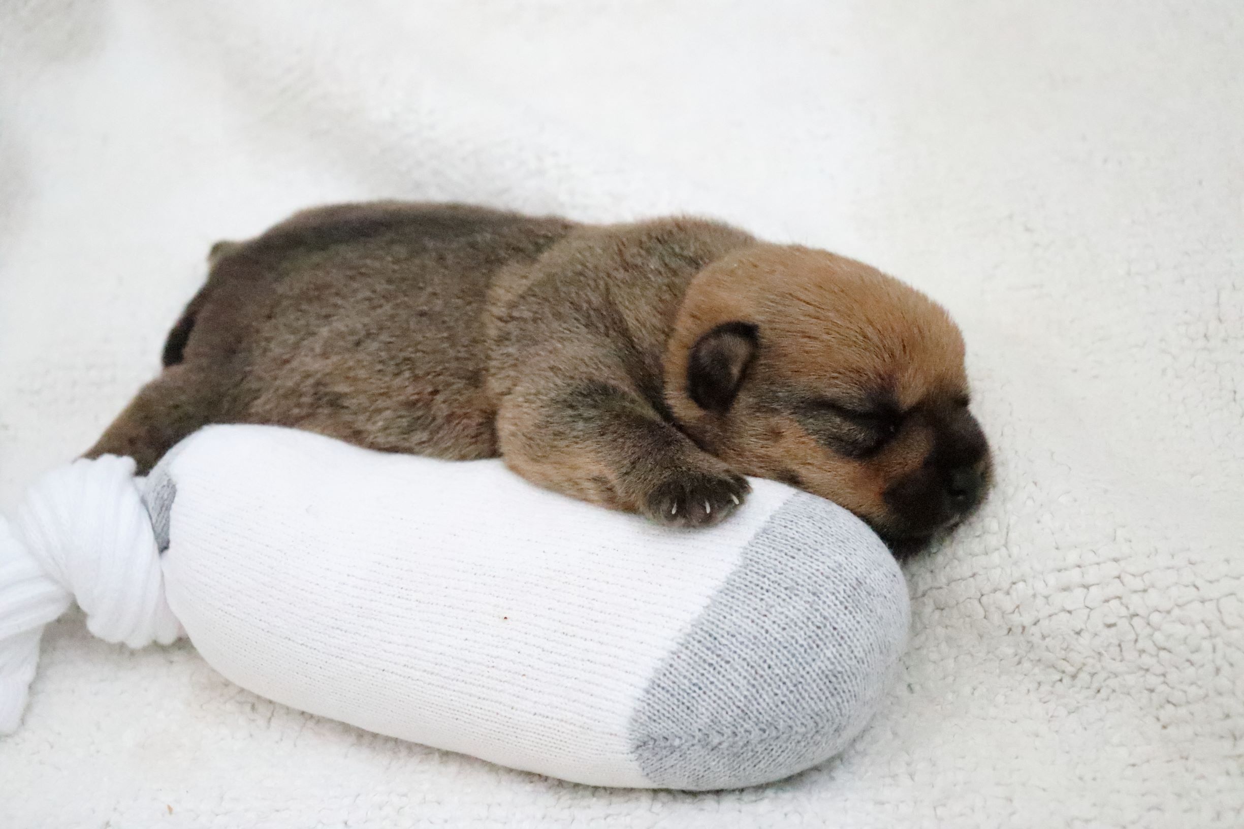 Normally when a mother goes outside to do her potty business, puppies will all gather in a pile to conserve heat. Being a singleton, my puppy just starts whimpering as she has no siblings. I have been picking her up and holding her until mommy comes back. Today I started experimenting with using a sock filled with uncooked rice and heated in my microwave, as an artificial sibling.