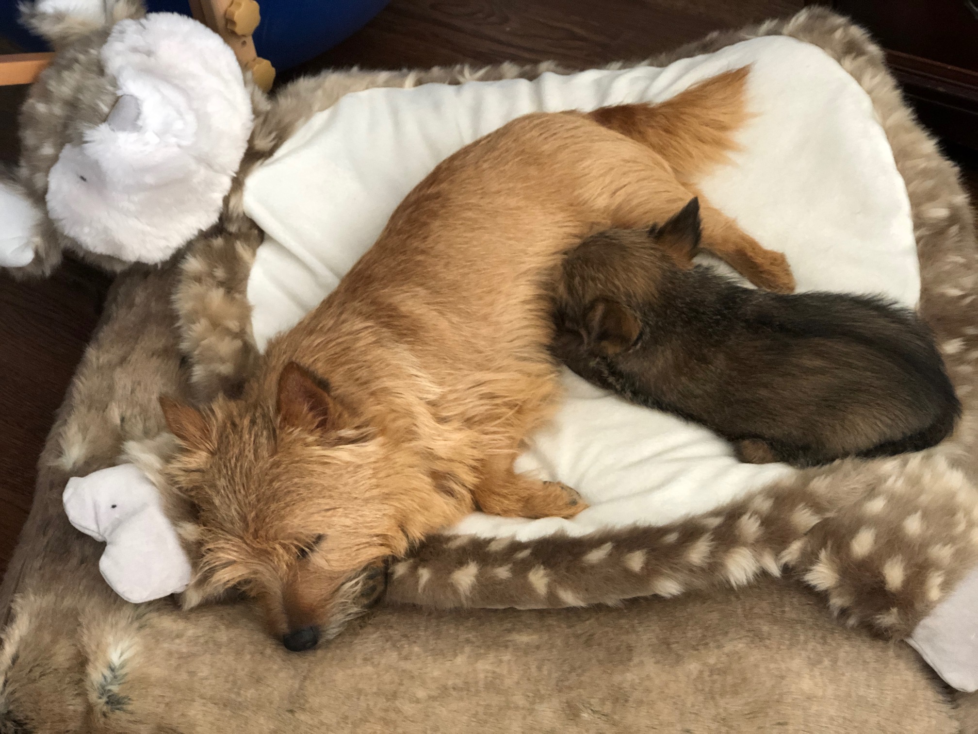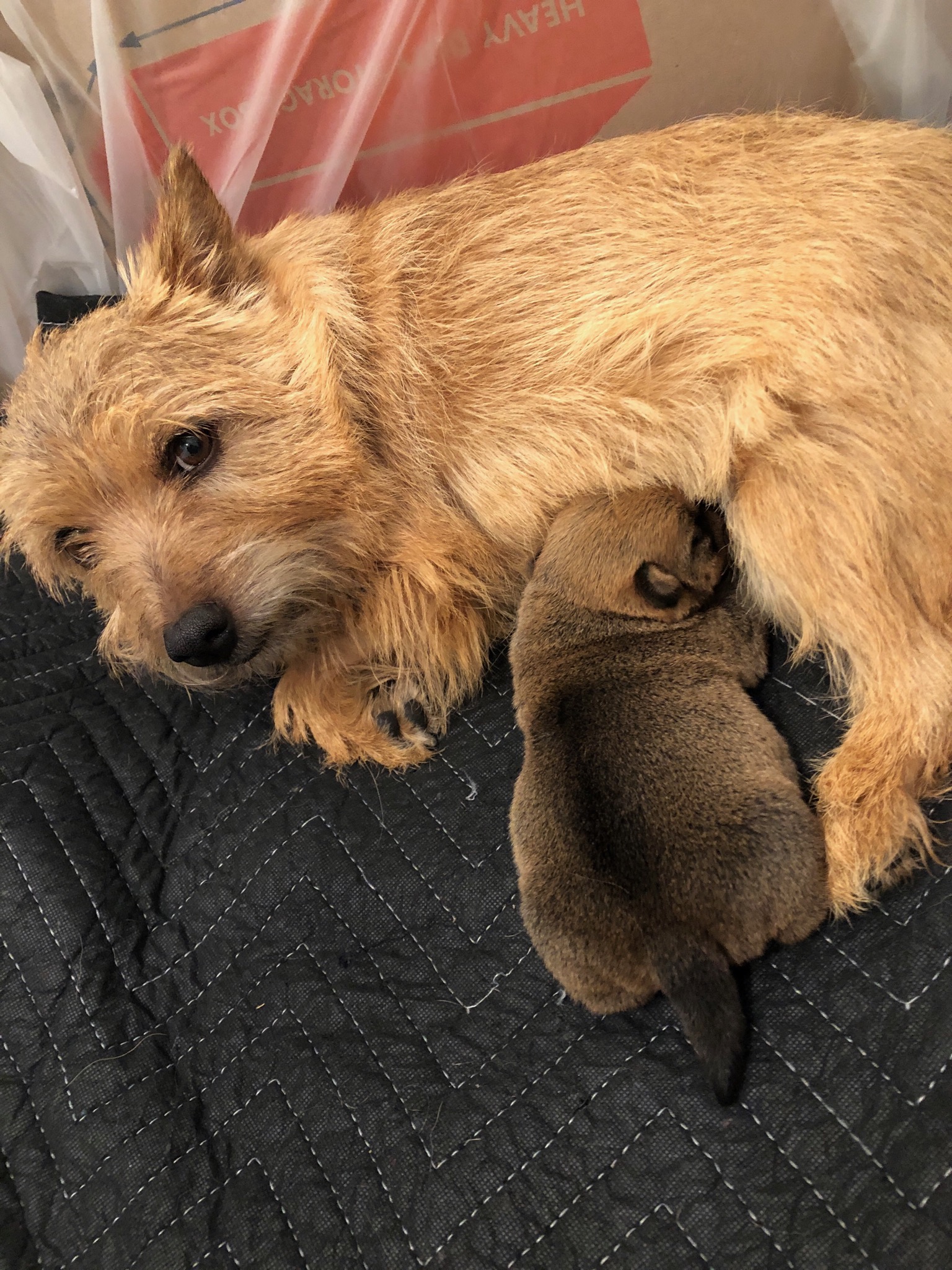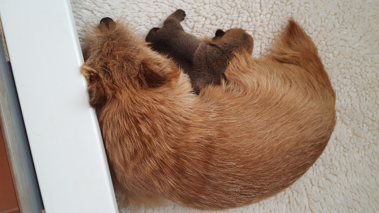 Normally when a mother goes outside to do her potty business, puppies will all gather in a pile to conserve heat. Being a singleton, my puppy just starts whimpering as she has no siblings. I have been picking her up and holding her until mommy comes back. Today I started experimenting with using a sock filled with uncooked rice and heated in my microwave, as an artificial sibling.
