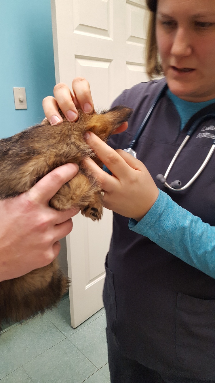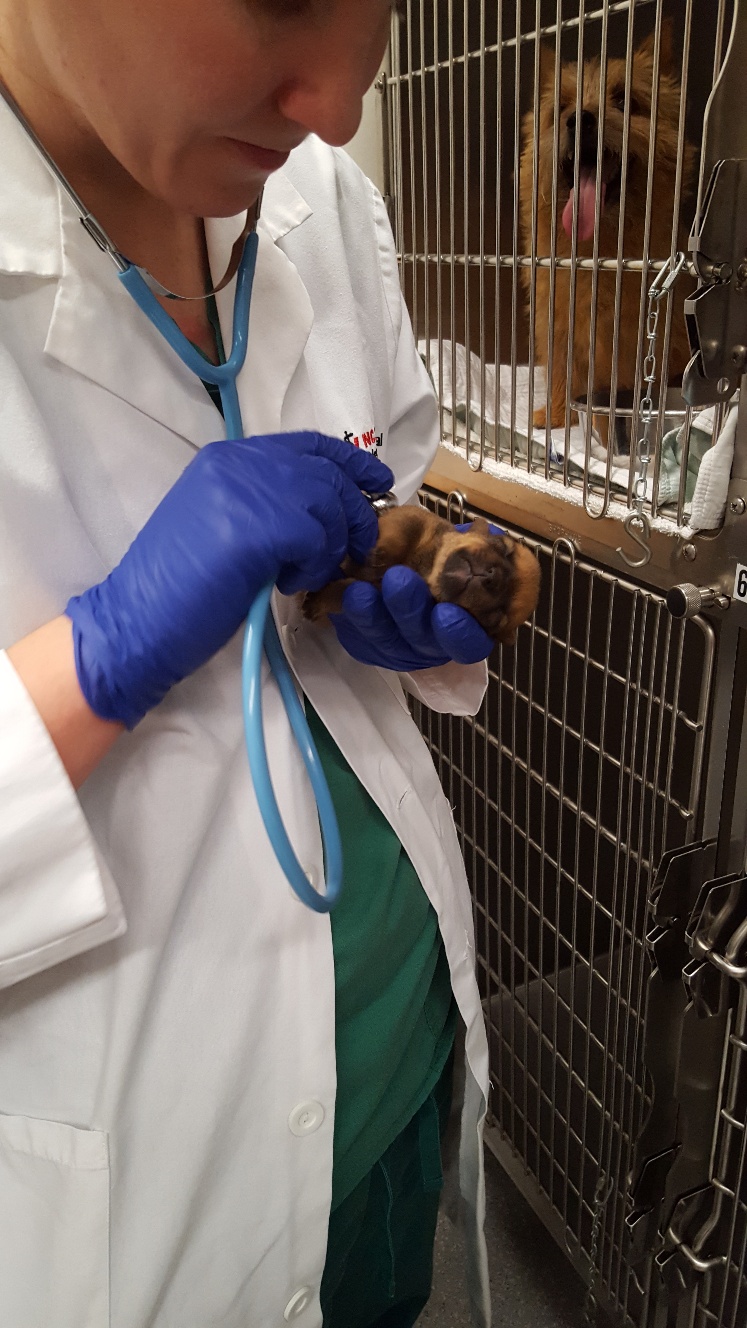 At NC State, the repro vets carefully checked Mandy's incision and nipples. Everything looked fine. Next, was an ultrasound. The ultrsound showed that Mandy had some fluid in her uterus, and that the uterus had not shrunk normally. Mandy was given a shot of oxytocin for her uterus. Next, Mandy had a blood draw to check her blood chemistry. Then we had to wait for the blood results. While waiting, the puppy got checked out. Another picture of the puppy. While waiting, Mandy continued to keep the puppy clean.