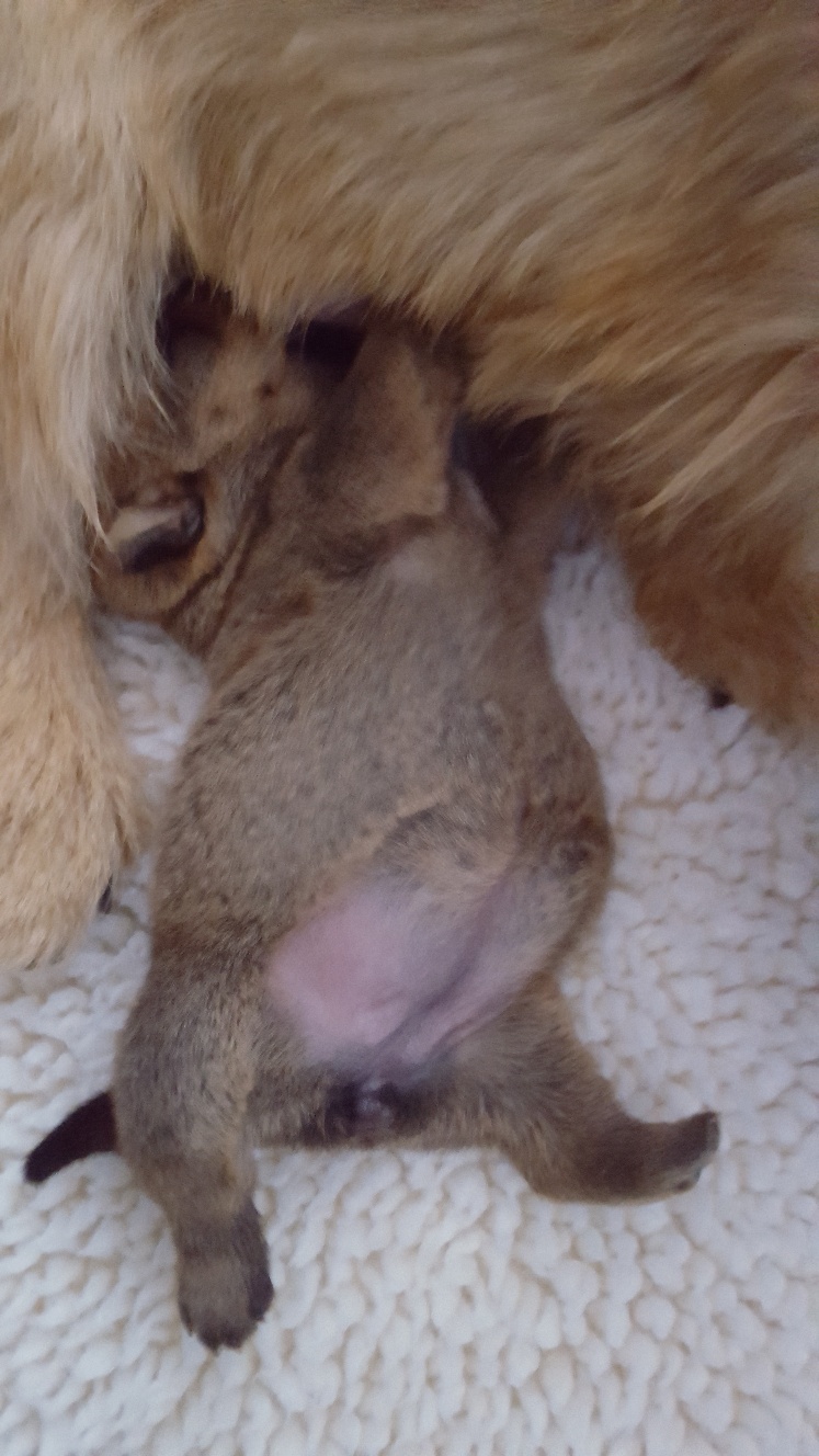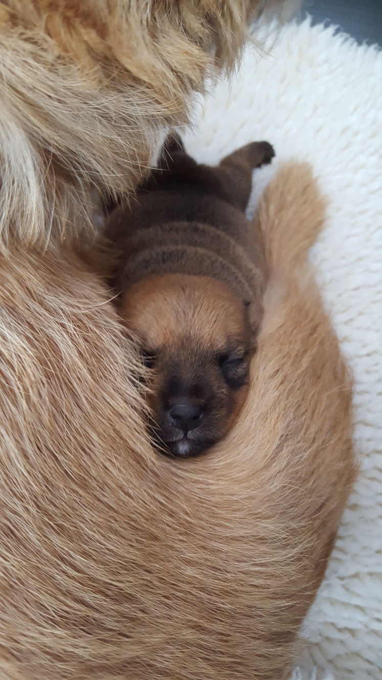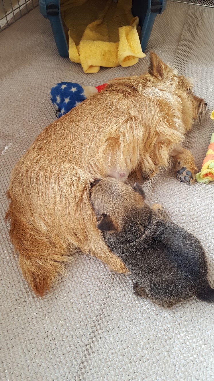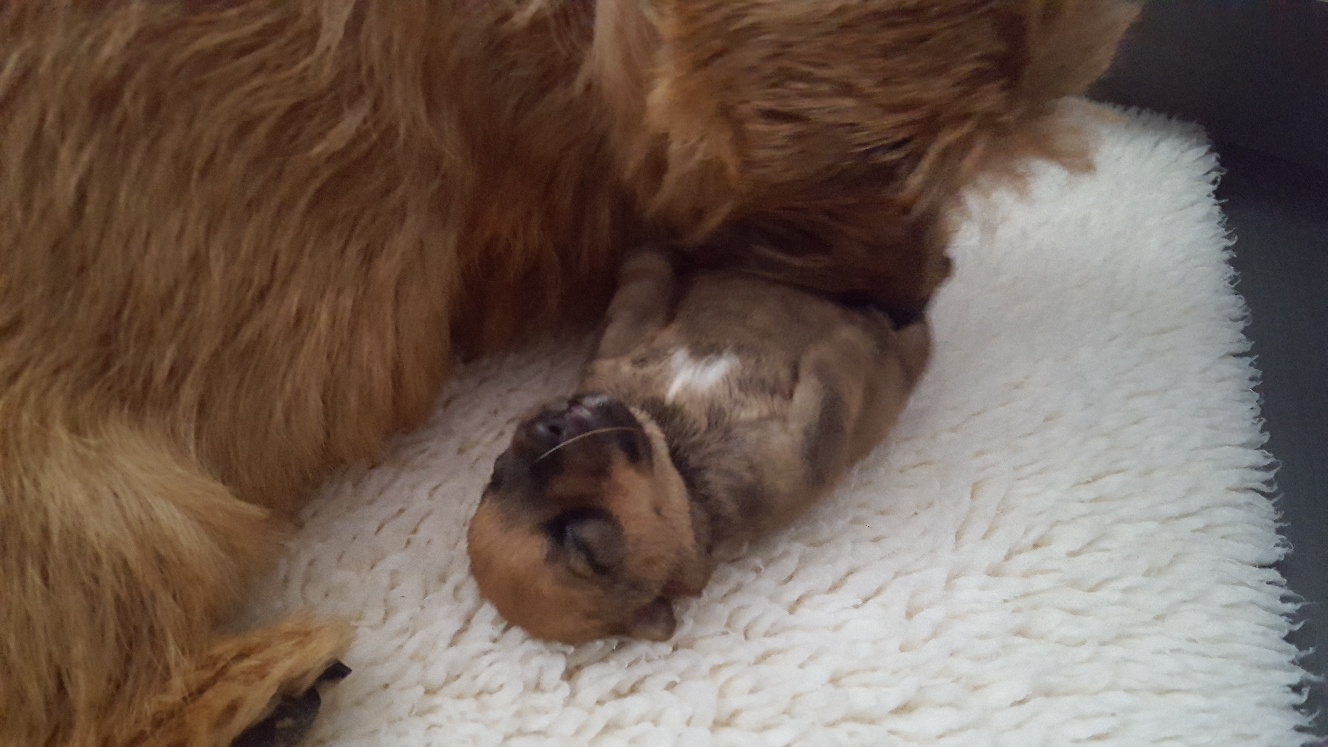 Here is a picture of the puppy while she is nursing that shows her size. The red coloring in the picture is from my heat lamp that is over the whelping box.