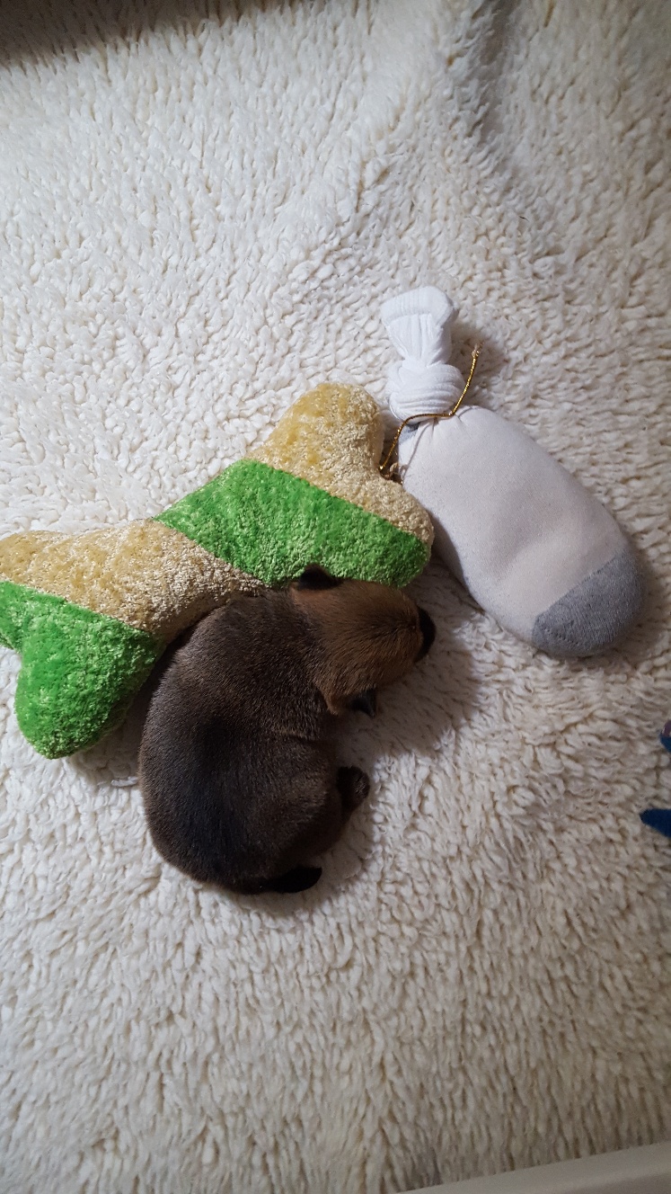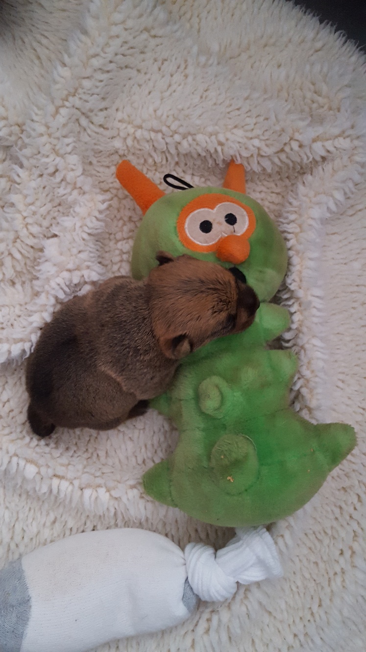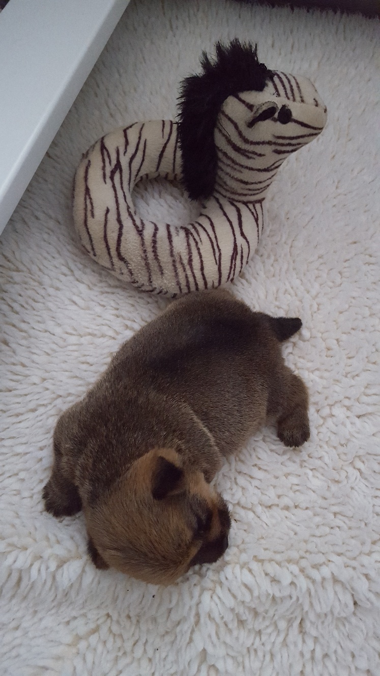 After a fearsome battle with an alien invader of the whelping box, a tired puppy rests on the defeated body of her foe.