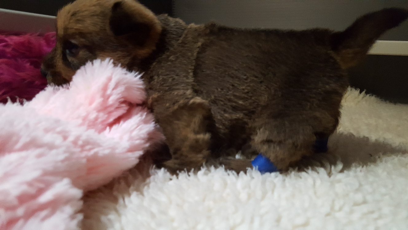 With Sir's hind legs hobbled, she is able to look out of the whelping box, stand on her own, and even walk for a few steps before she plunks down. She clearly knows what to do, but the muscles in her hind legs are not strong enough to carry her belly.