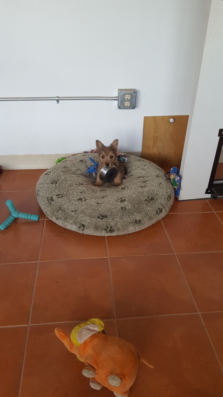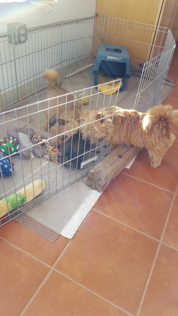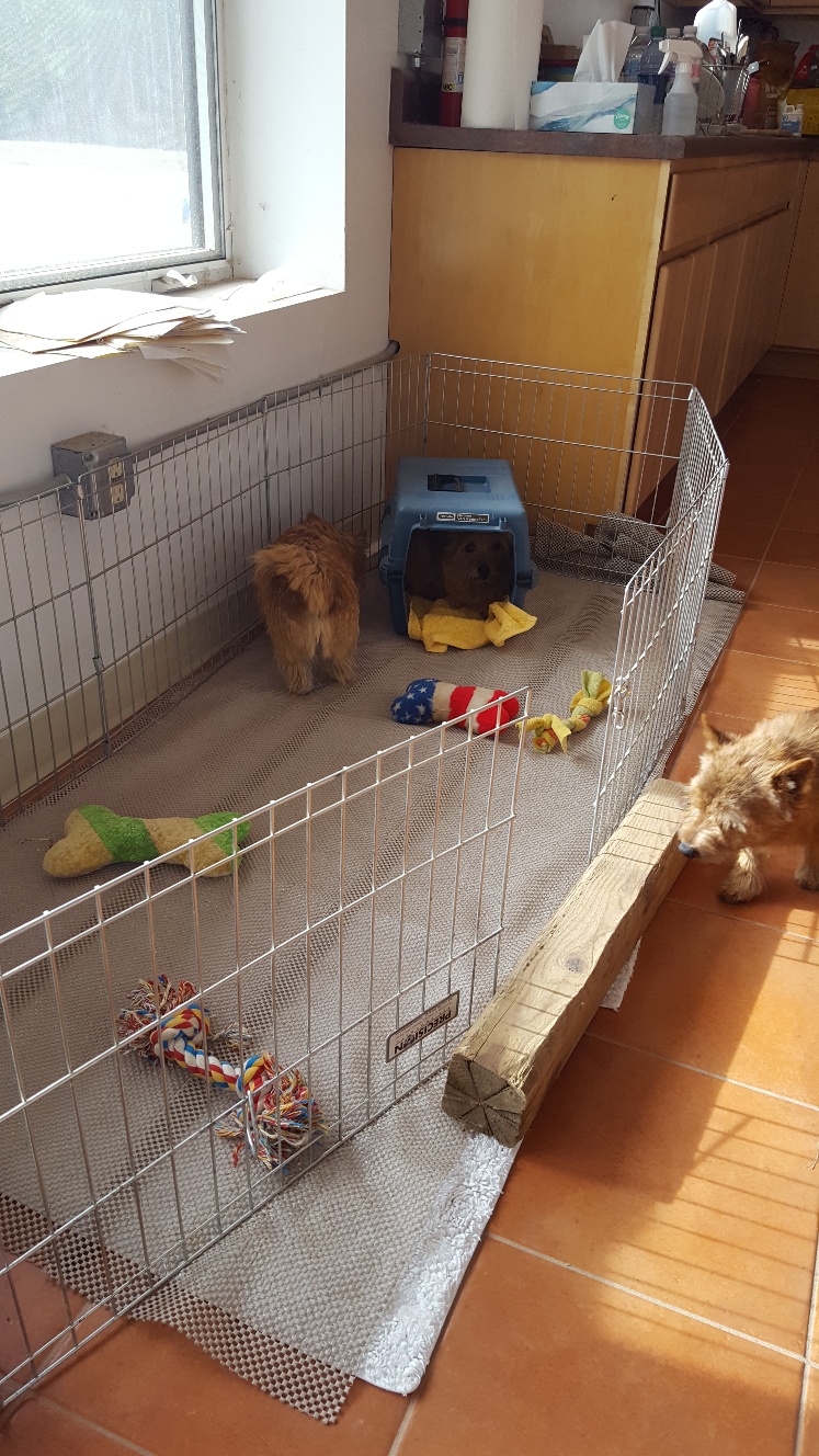Today I decided to build Siri's play area next to my desk. Some of my other dogs had to inspect and give their approval. Note Mandy inside the crate.