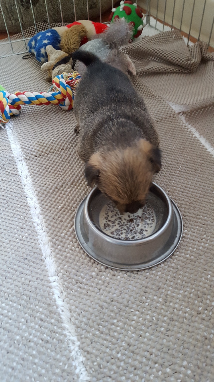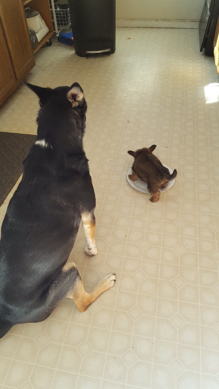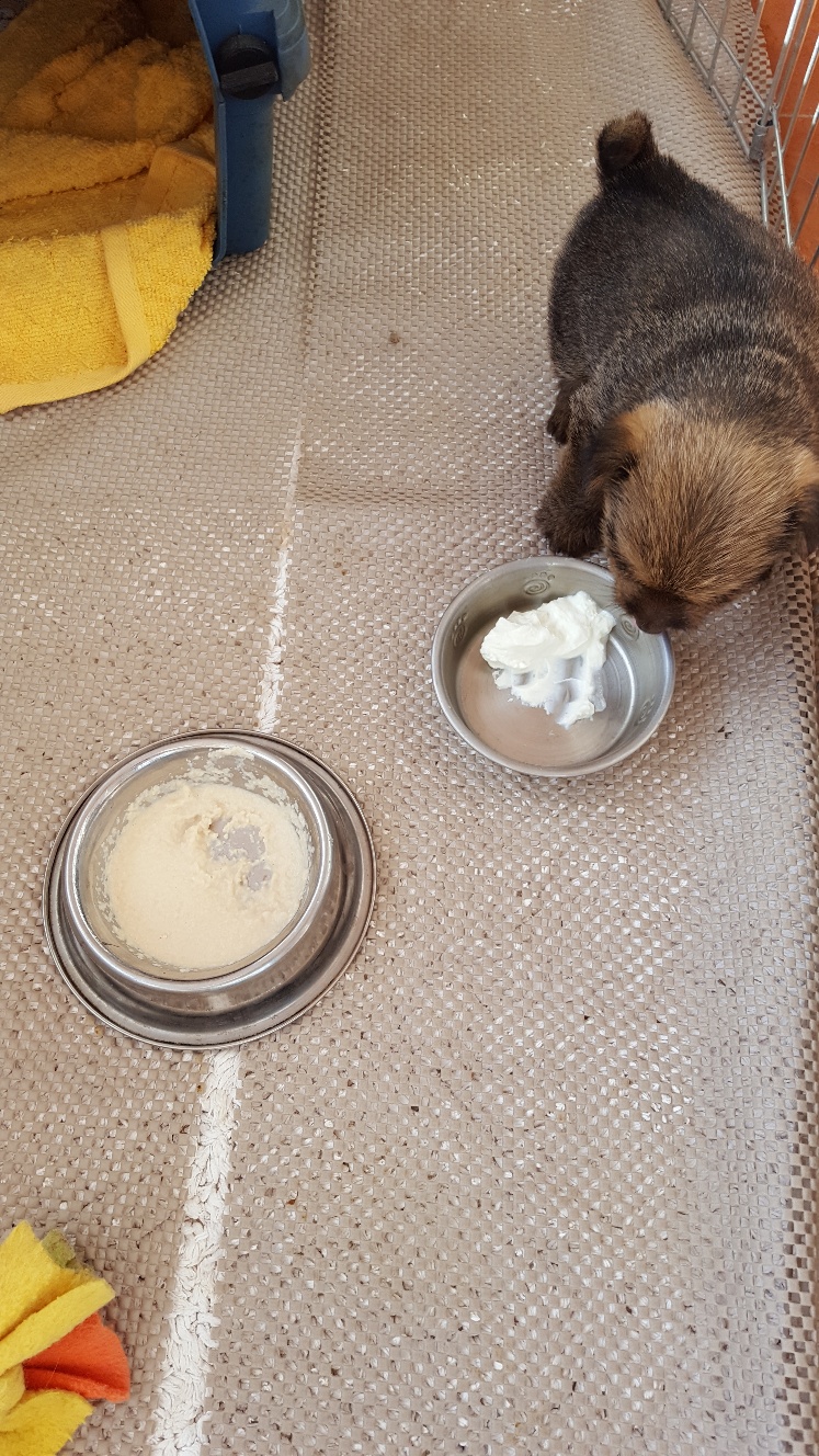 I remembered today that instead of starting with ground kibble, I should be starting with baby rice cereal mixed with Esbilac. Siri approved of this change of cuisine. Of course Mandy likes to eat what Siri leaves