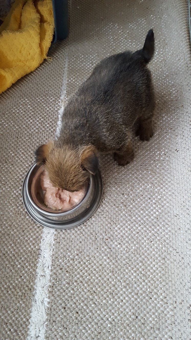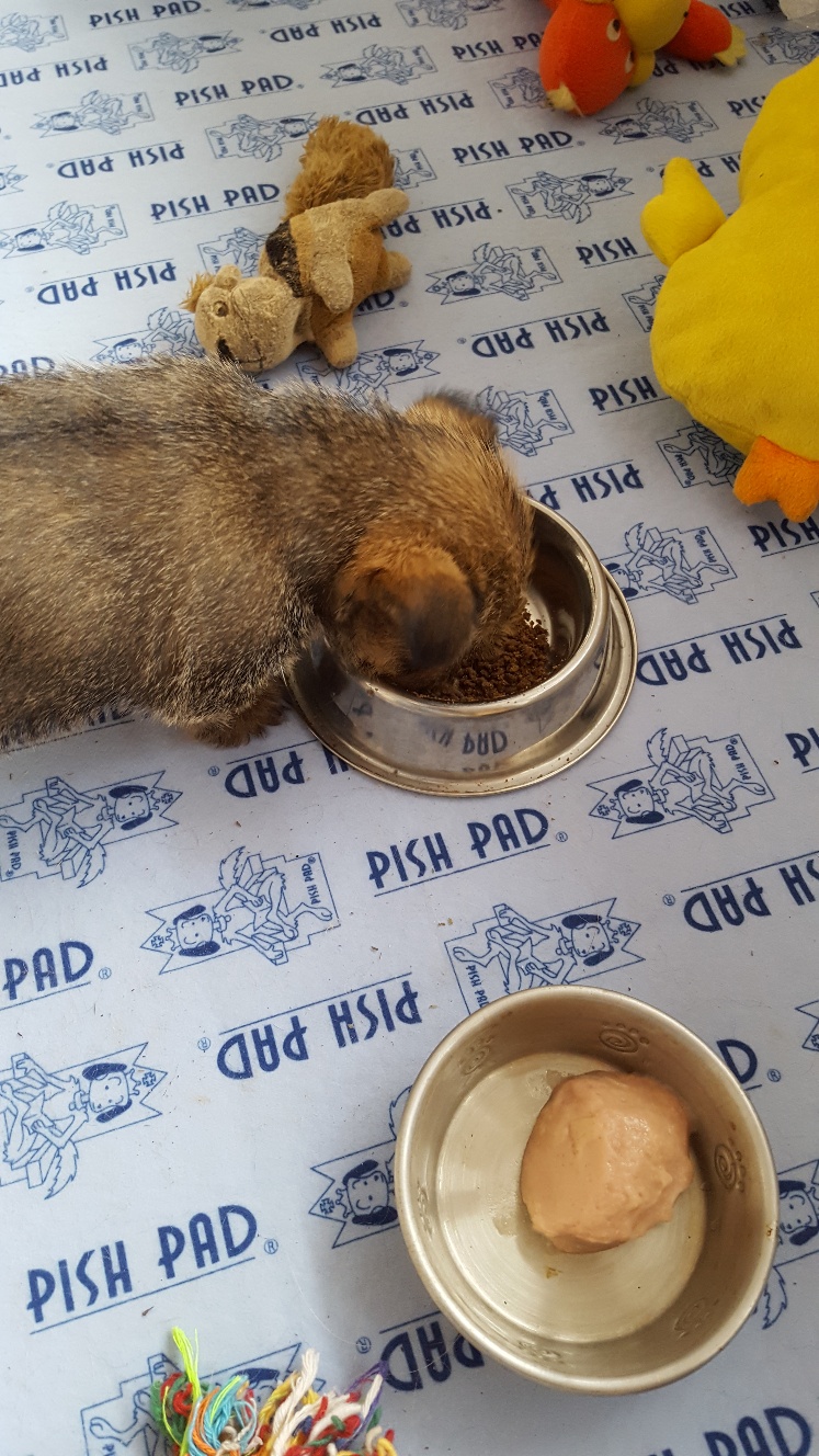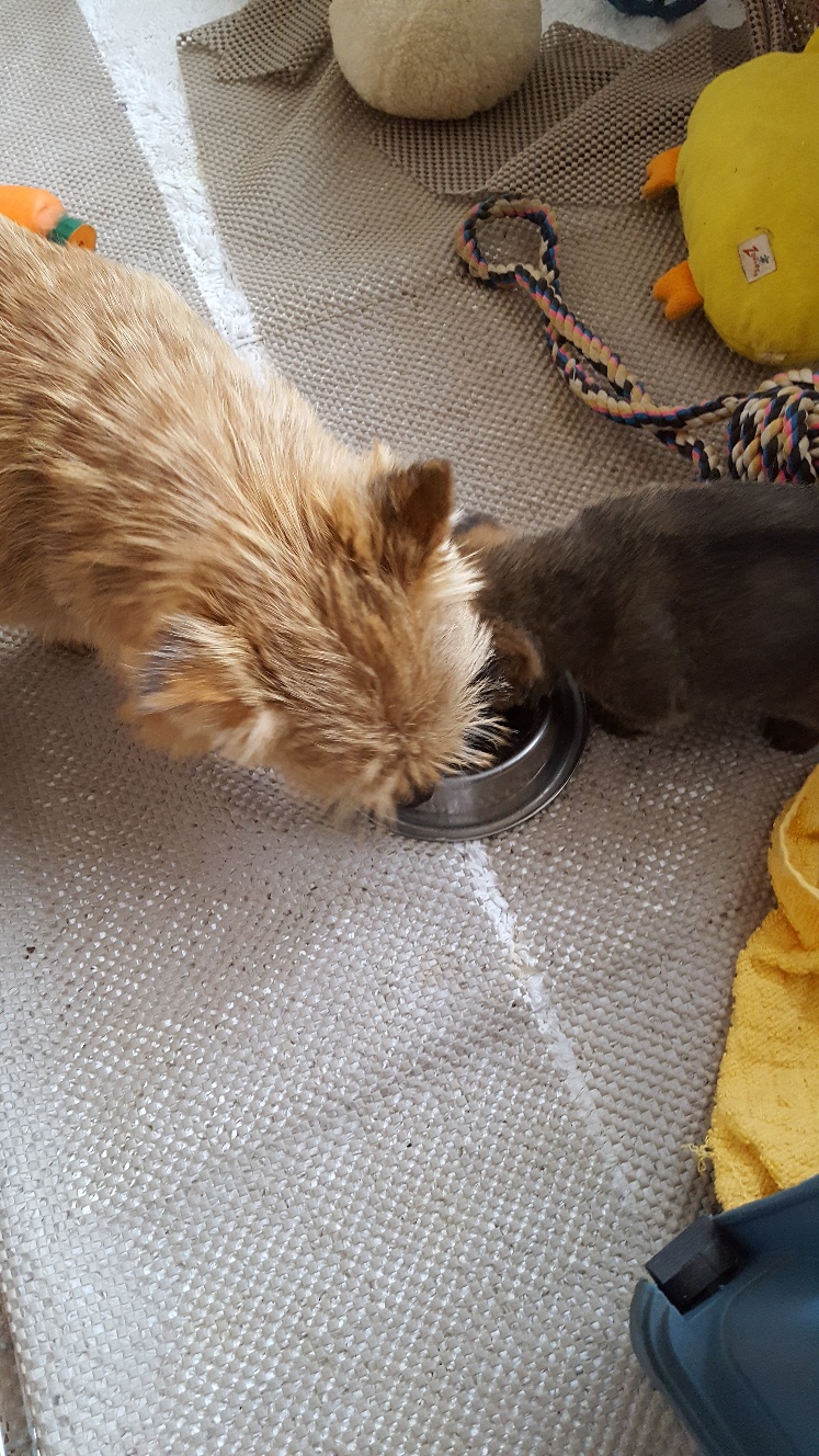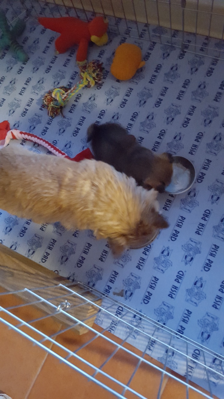 I remembered today that instead of starting with ground kibble, I should be starting with baby rice cereal mixed with Esbilac. Siri approved of this change of cuisine. Of course Mandy likes to eat what Siri leaves