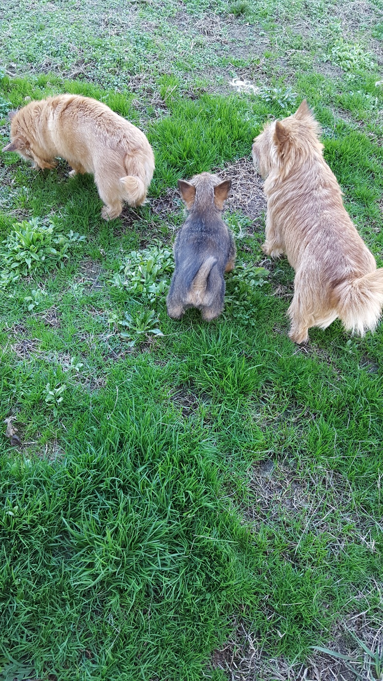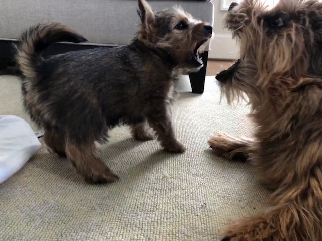 her back, and there is much growling from all three.