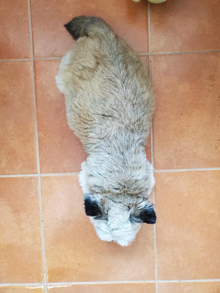 Blue has learned the most efficient way to get milk. Blue sleeping next to the purple bunny.