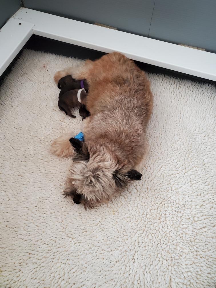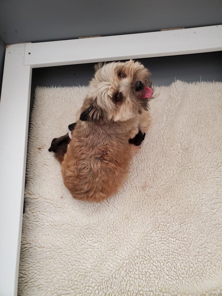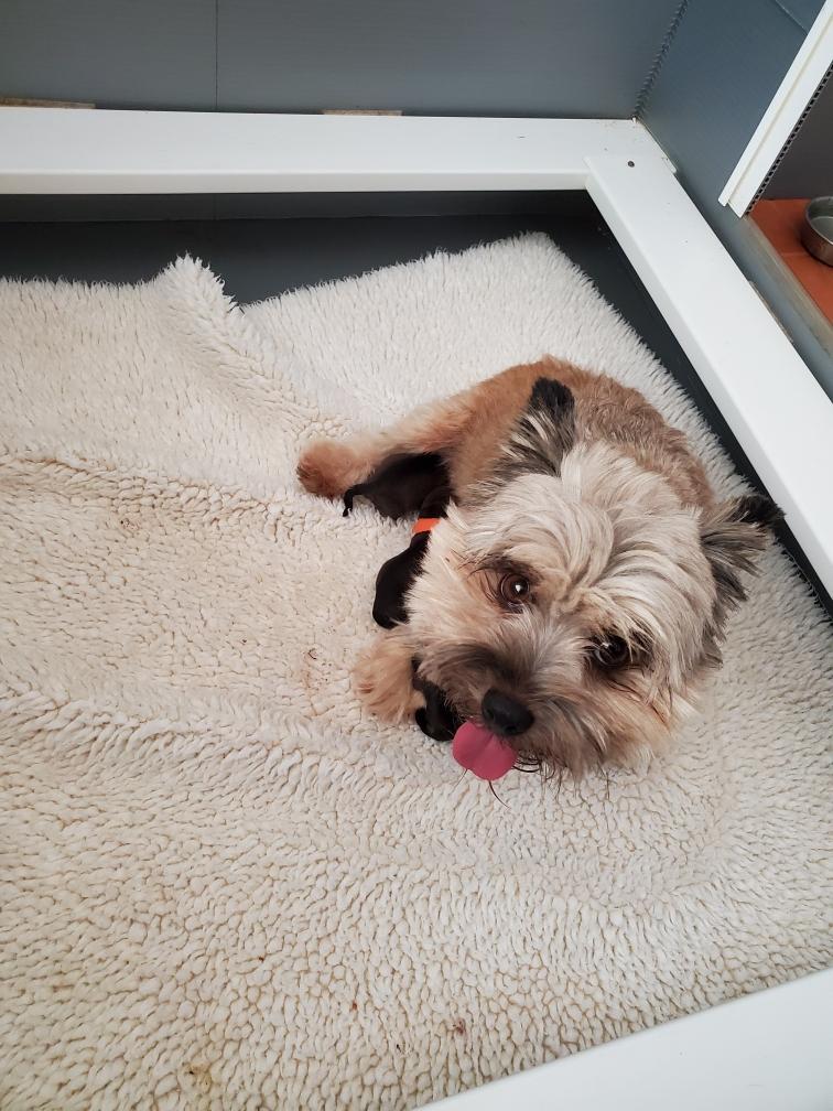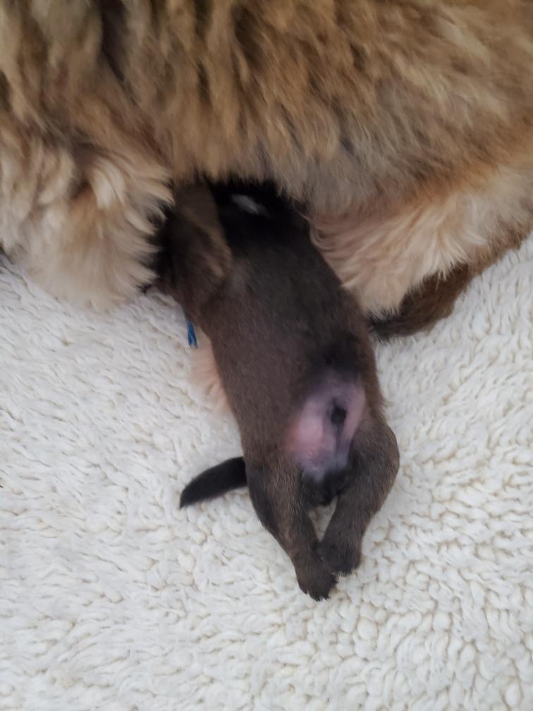 Around 10 pm, I got a phone call from the resident (junior) repro vet that Polly's c-section was starting. A 11 pm, the attending (senior) repro vet came out to tell me that Polly and her four puppies were all doing well, and that it was two boys and two girls. He apologized that it had taken so long to start the c-section, but explained that an emergency hospital has to prioritize and that it takes time to clean up and setup a surgical suite for another procedure. I asked, but he said that he did not have a good answer as to why Polly was not able to deliver naturally. Polly was having contractions, so it was not a problem of uterine inertia. The head of the puppy in the birth canal was not too large - he said he could get a finger around the puppy's head when examining Polly - so it was not a problem of fetal-pelvic disproportion. So we are left with a mystery. Shortly afterwards, I got my first look at the puppies. Polly was still pretty groggy from the anesthesia.