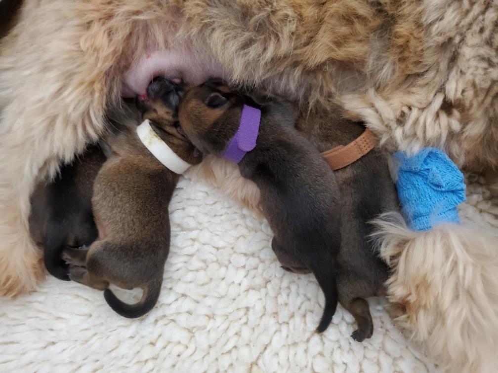 Puppies nursing. At nursing time there is a lot of slurping sounds. The puppies are generally quiet. Pink is probably the most vocal. Today rather than just a squeak, I heard Pink make a trilling sound as her mother cleaned her.