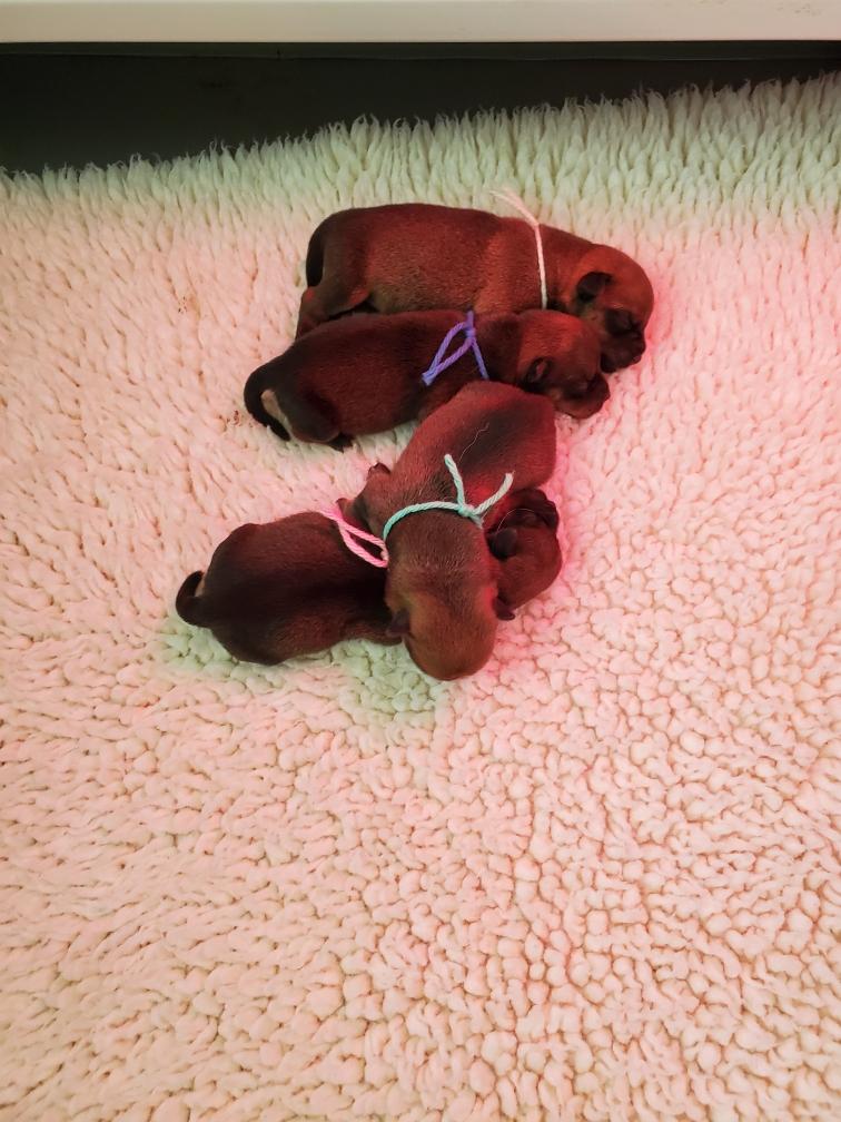 The two brothers, White and Blue, sleeping next to each other, while Green uses her sister Pink as a pillow. The reddish glow is from my heat lamp. When Polly leaves the whelping box, I turn on the heat lamp on to keep the puppies warm. Usually right after I turn the heat lamp on, Polly jumps back in the whelping box. So I have to turn off the lamp otherwise Polly gets too warm. A butler's job is never done.
