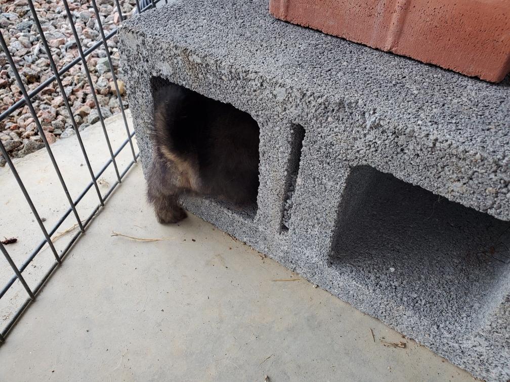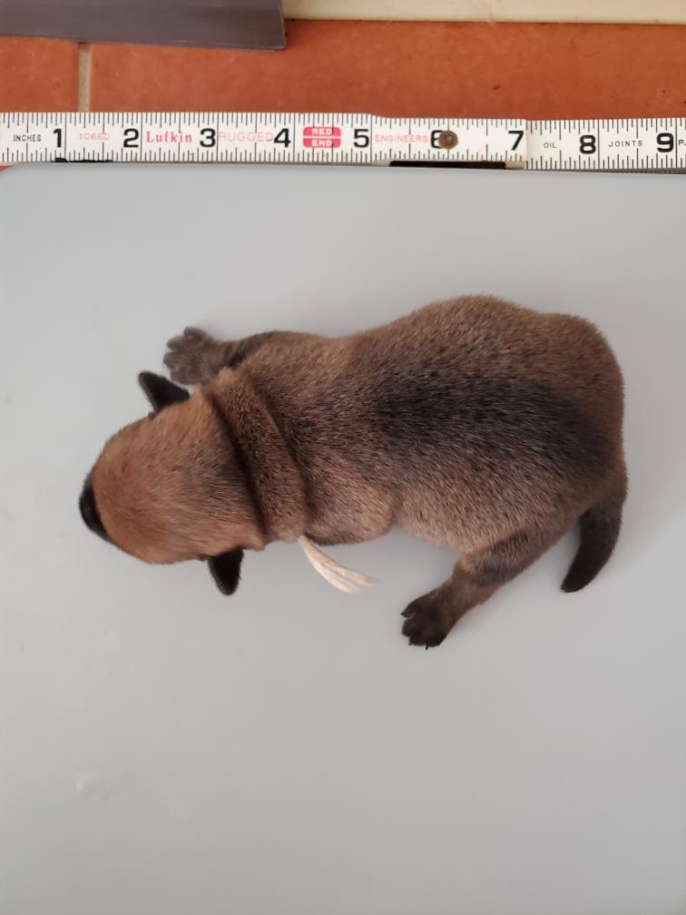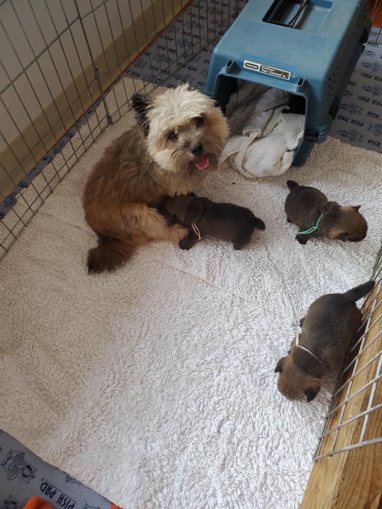 Polly and morning puppies. I can tell from the picture that it is morning because the puppies have not soiled the mats. Now that the puppies are bigger, Polly can not drink all their urine, so yellow spots appear on the mats during the day. And since I have started feeding the puppies - although the puppies are still getting most of their nutrition from their two mommies - Polly has said "Right, you clean up the messes." So add sanitation detail to my list of chores. This includes inspecting rear ends; and if necessary, cleaning any messy rear ends with a cotton ball dipped in warm water.