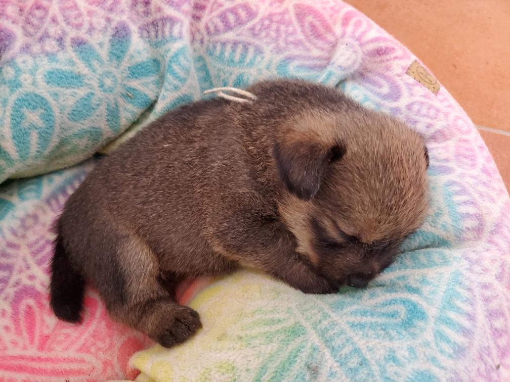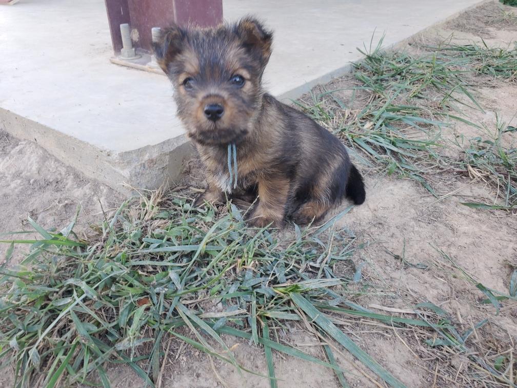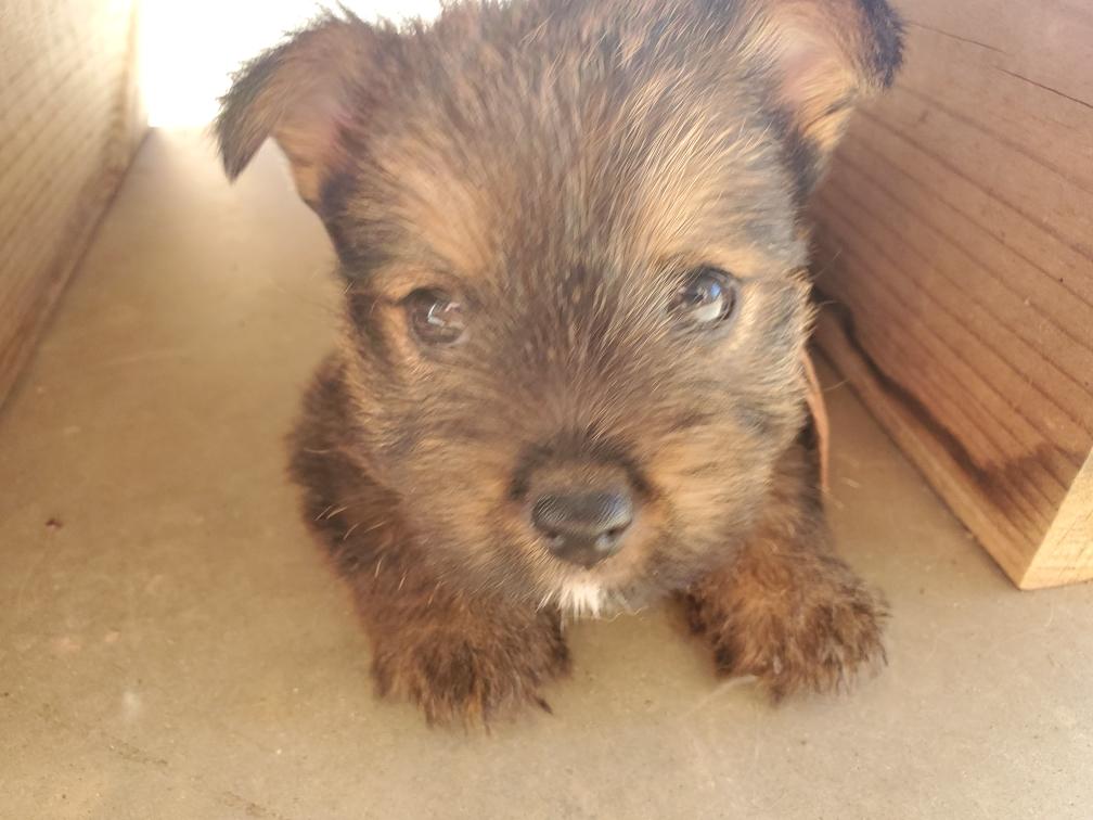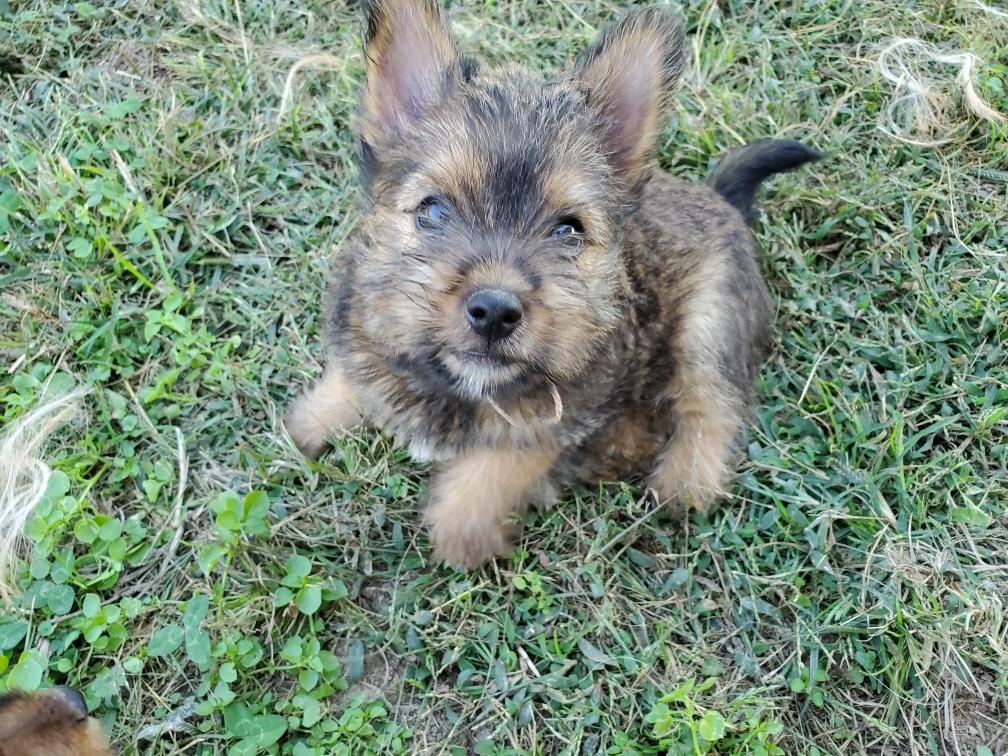 Polly is a "fluffy" Norwich. This means that Polly has two copies of the (recessive) long coat allele that makes a long (and soft) coat. So Polly does not look like a typical Norwich, either in terms of the feel of her coat or its color. In the picture, Polly is shaved down. Gunner does not carry the fluffy allele, so any puppies from a Gunner x Polly breeding will have a normal Norwich coat.