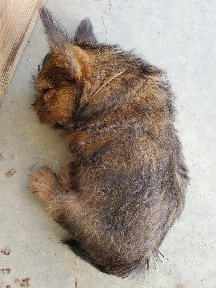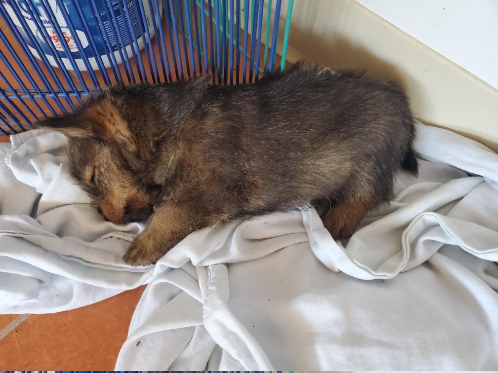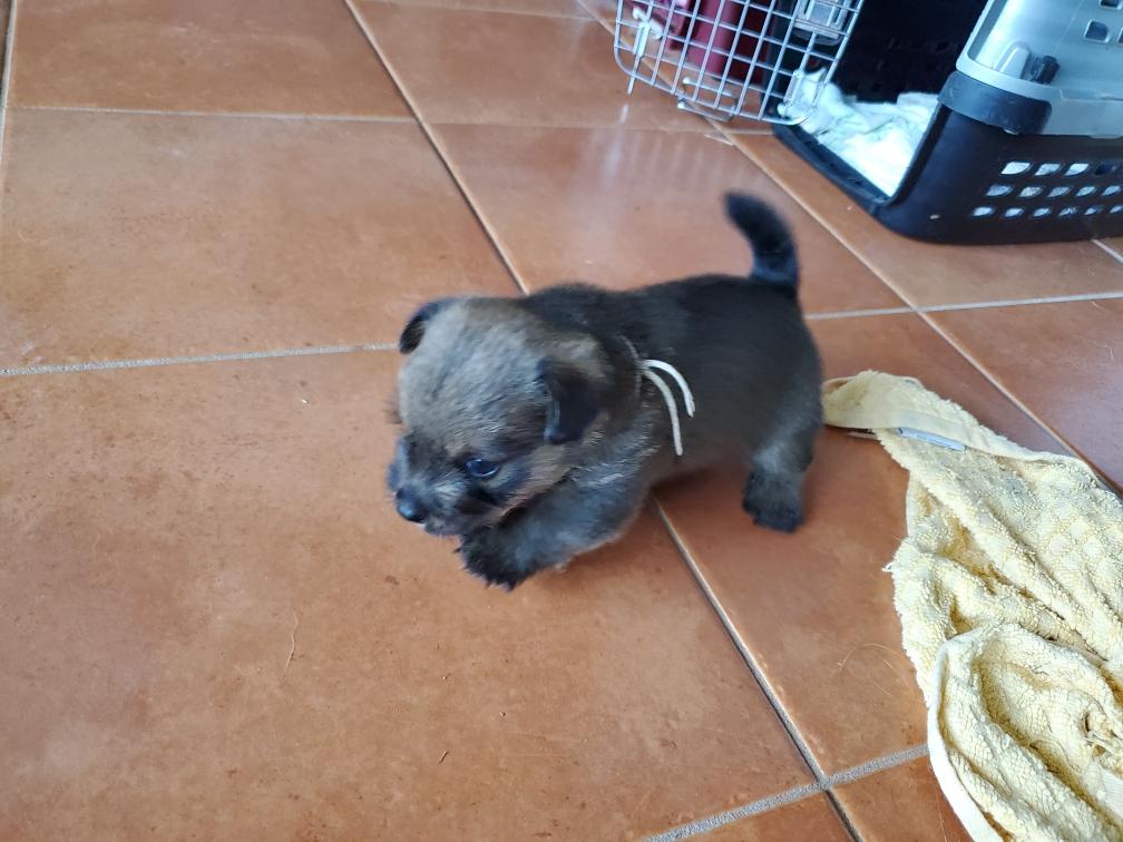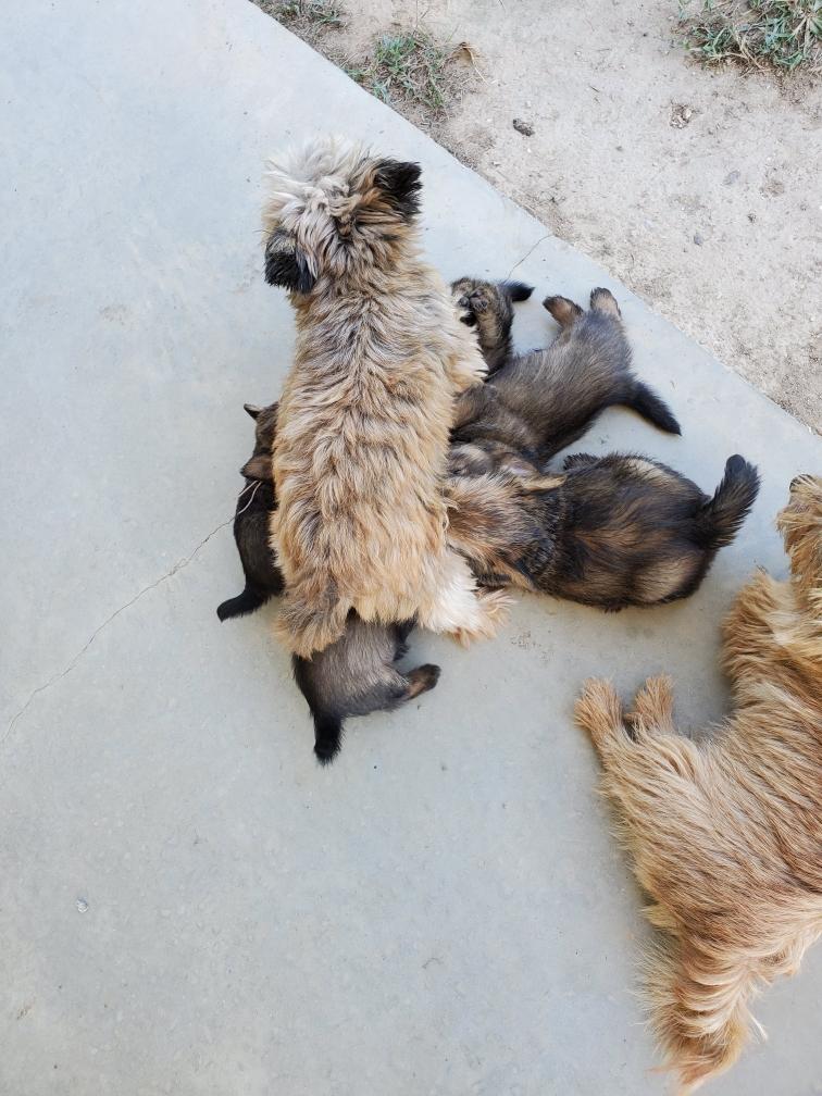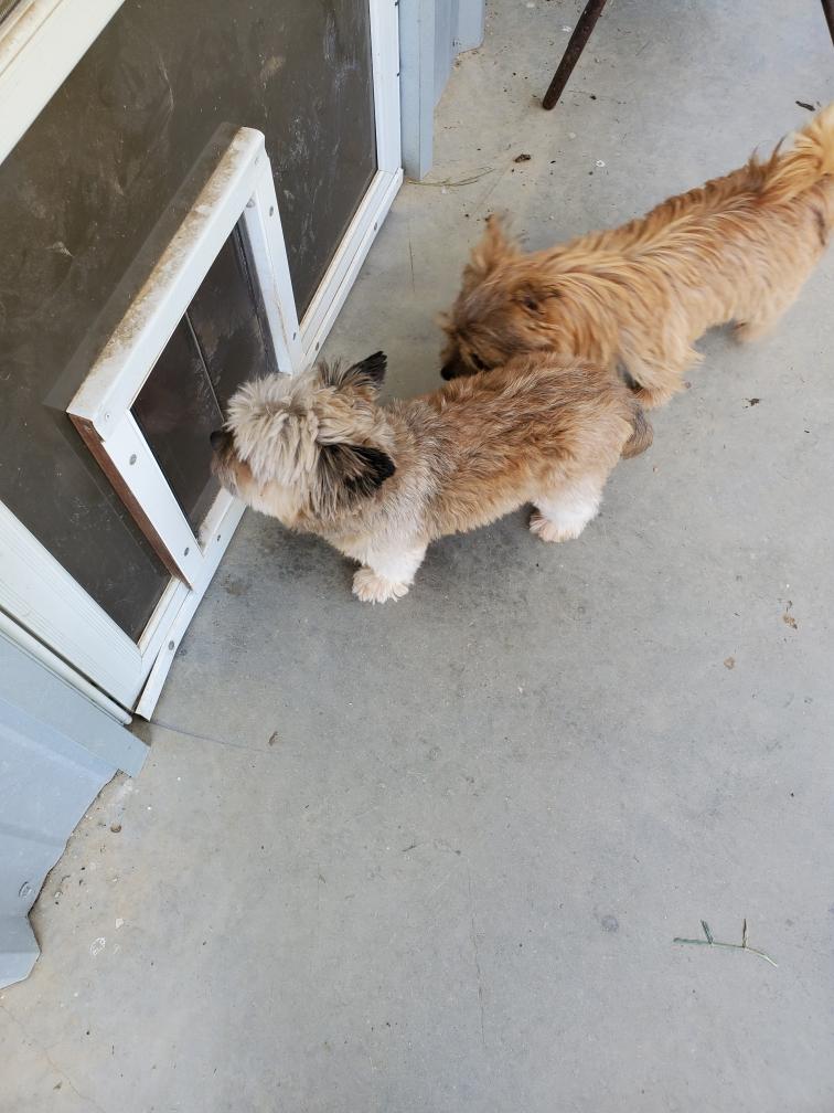 Polly is a "fluffy" Norwich. This means that Polly has two copies of the (recessive) long coat allele that makes a long (and soft) coat. So Polly does not look like a typical Norwich, either in terms of the feel of her coat or its color. In the picture, Polly is shaved down. Gunner does not carry the fluffy allele, so any puppies from a Gunner x Polly breeding will have a normal Norwich coat.