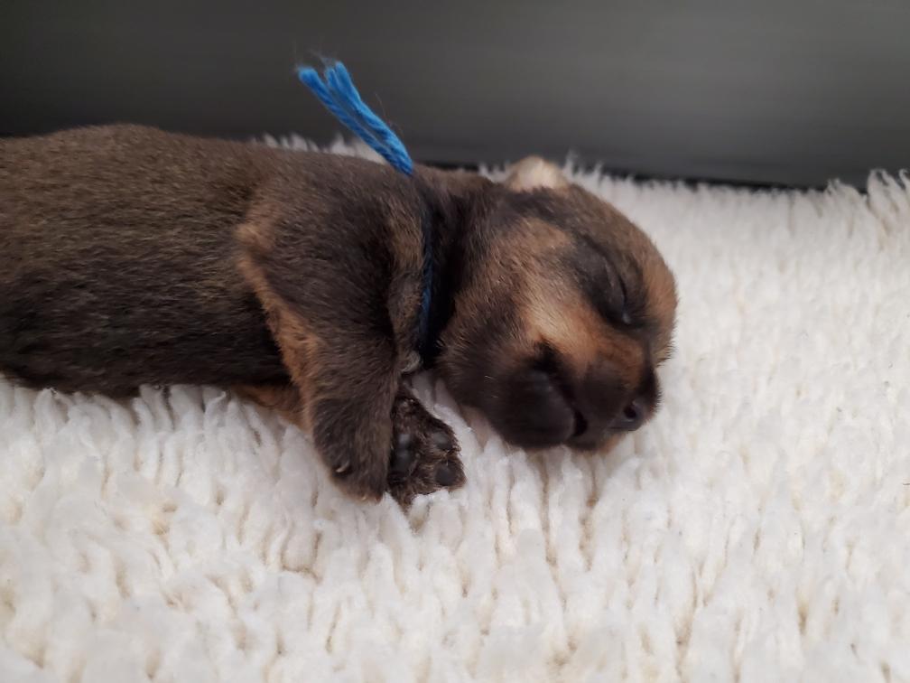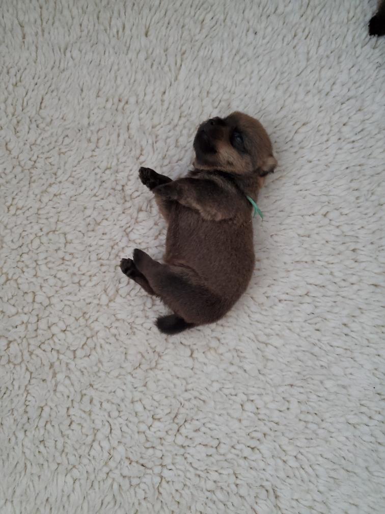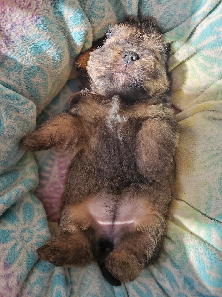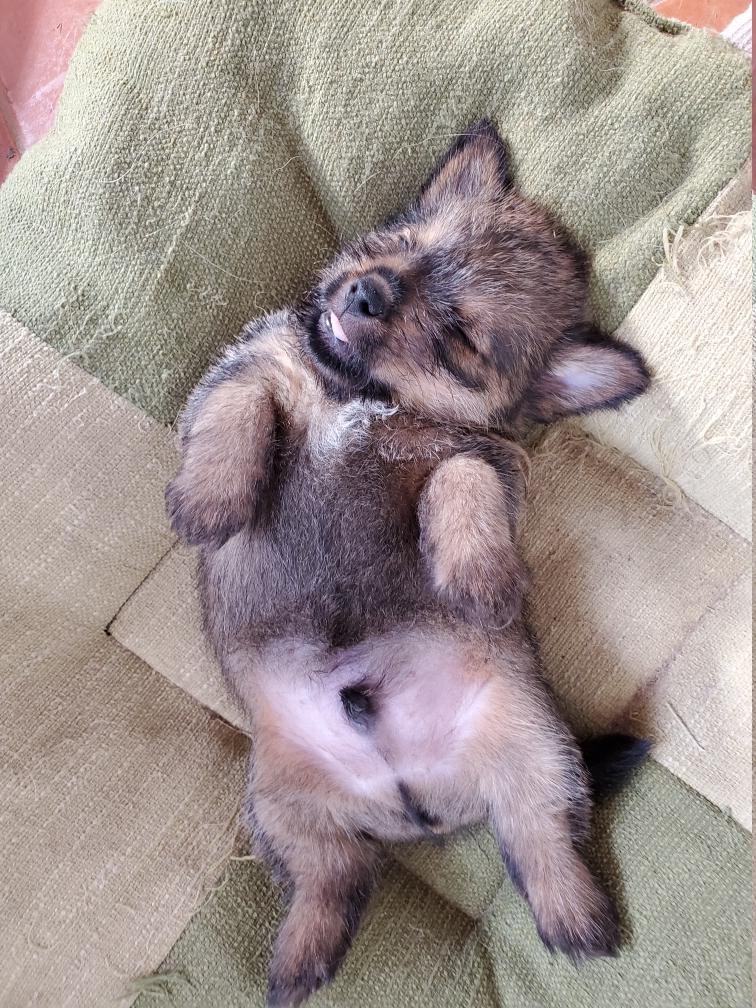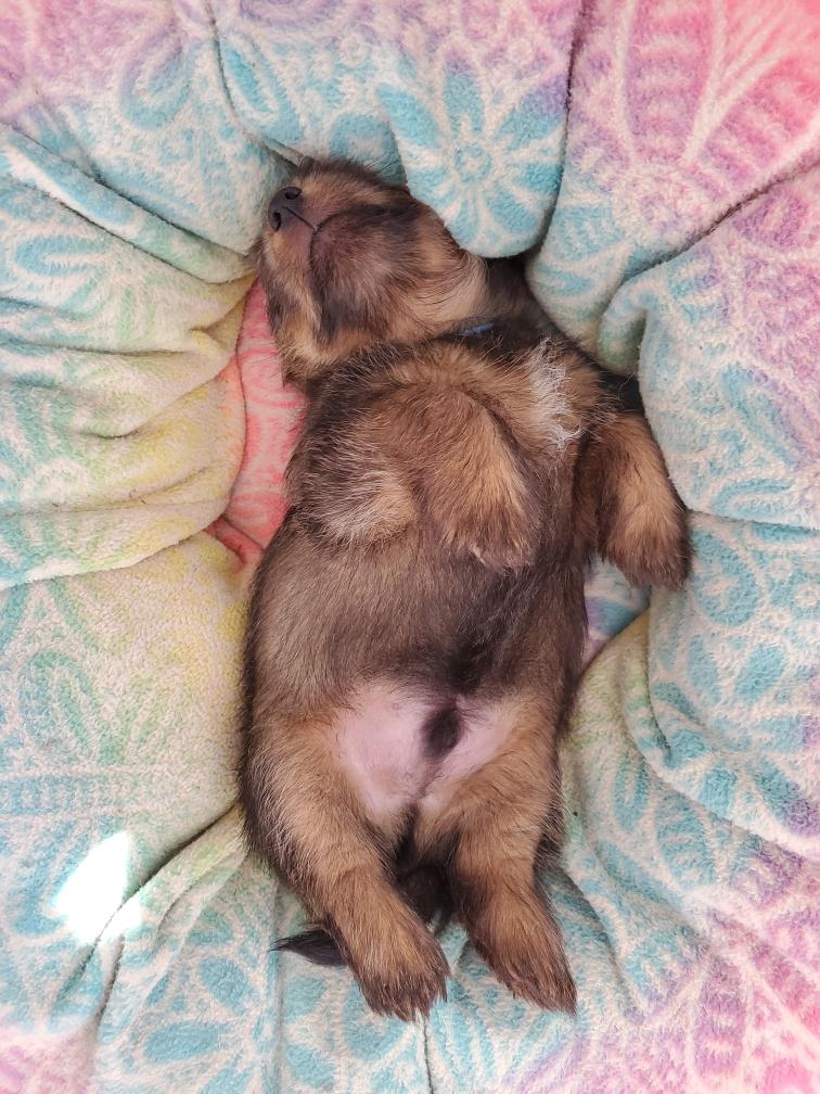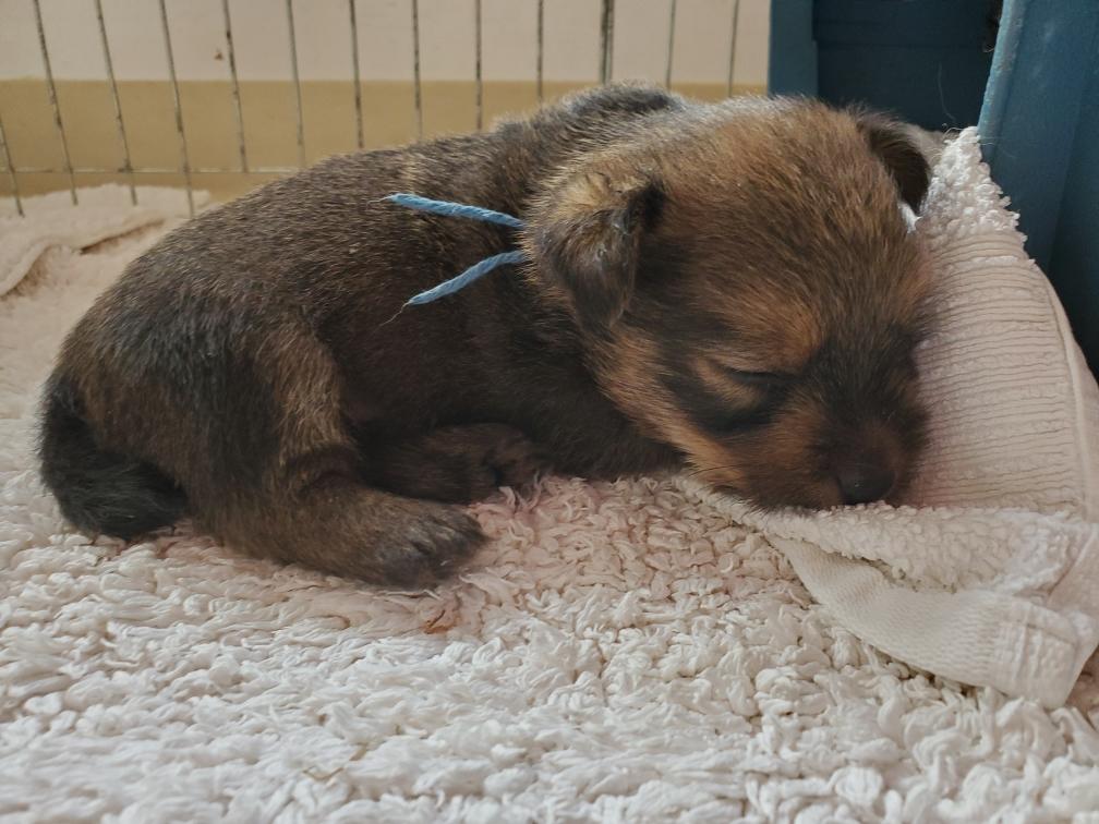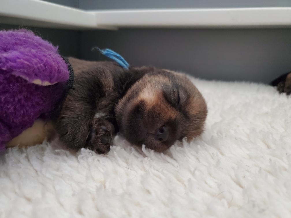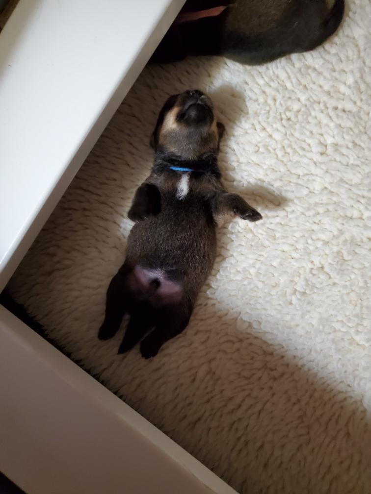 Blue is the first puppy to sleep on his back. The white patch on Blue's chest will "shrink" as he grows, until as an adult most likely the only white on Blue's chest will be a small line of white hairs.