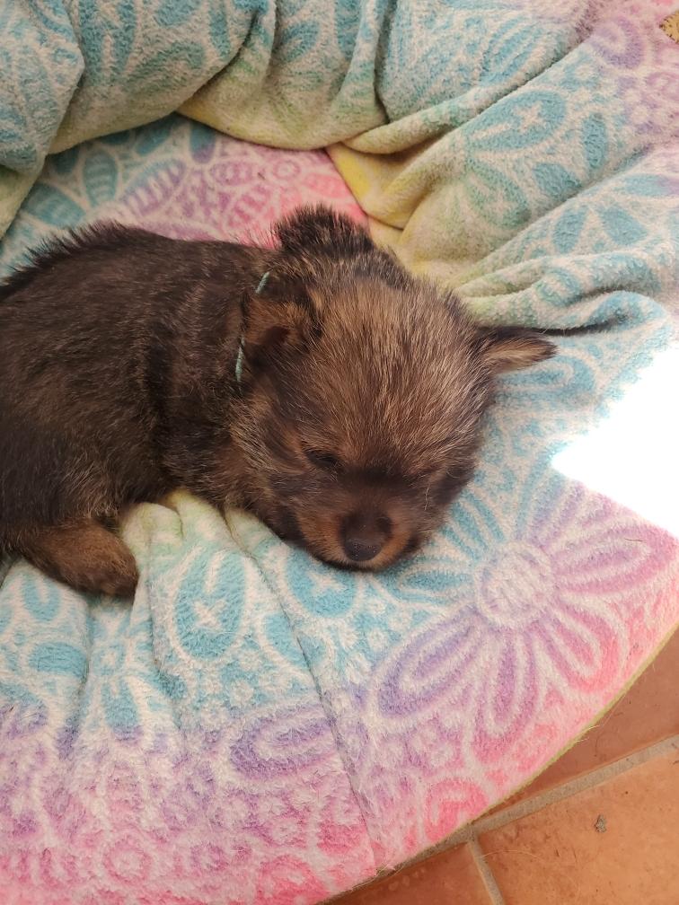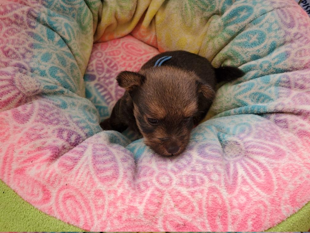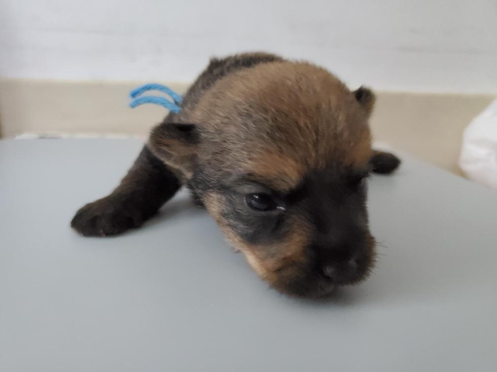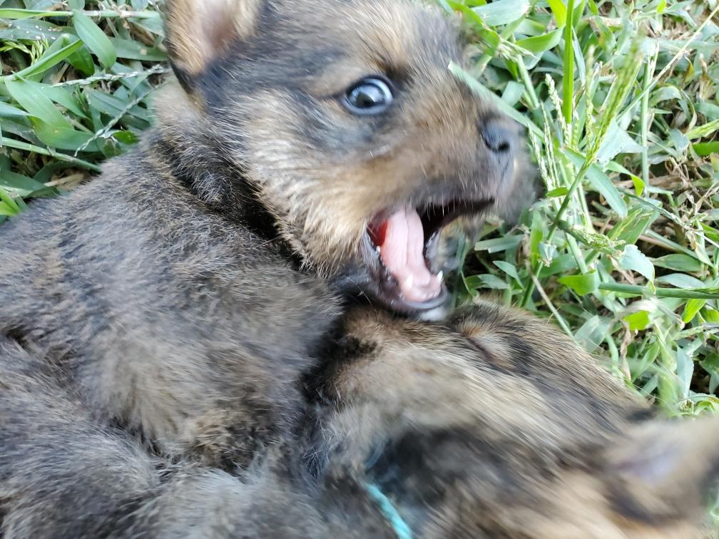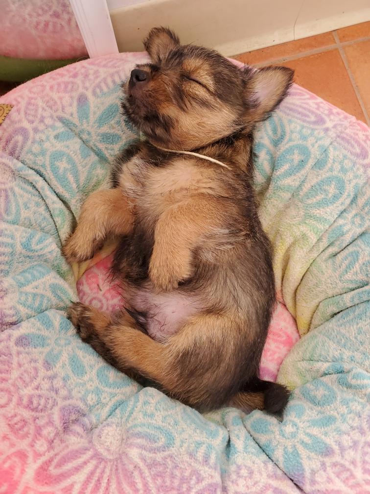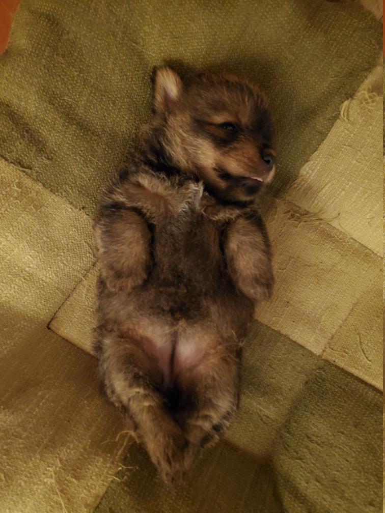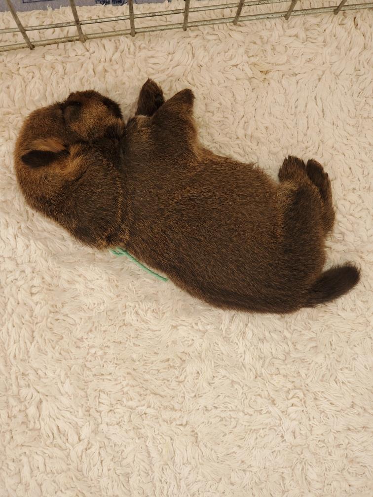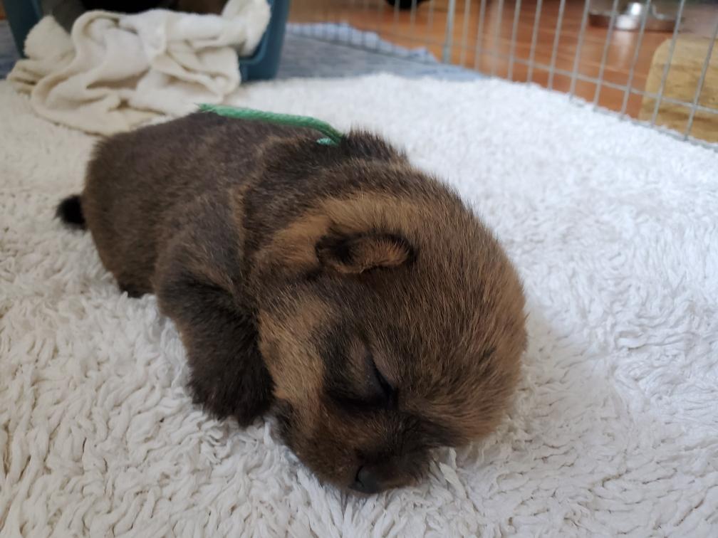 Blue is the first puppy to sleep on his back. The white patch on Blue's chest will "shrink" as he grows, until as an adult most likely the only white on Blue's chest will be a small line of white hairs.