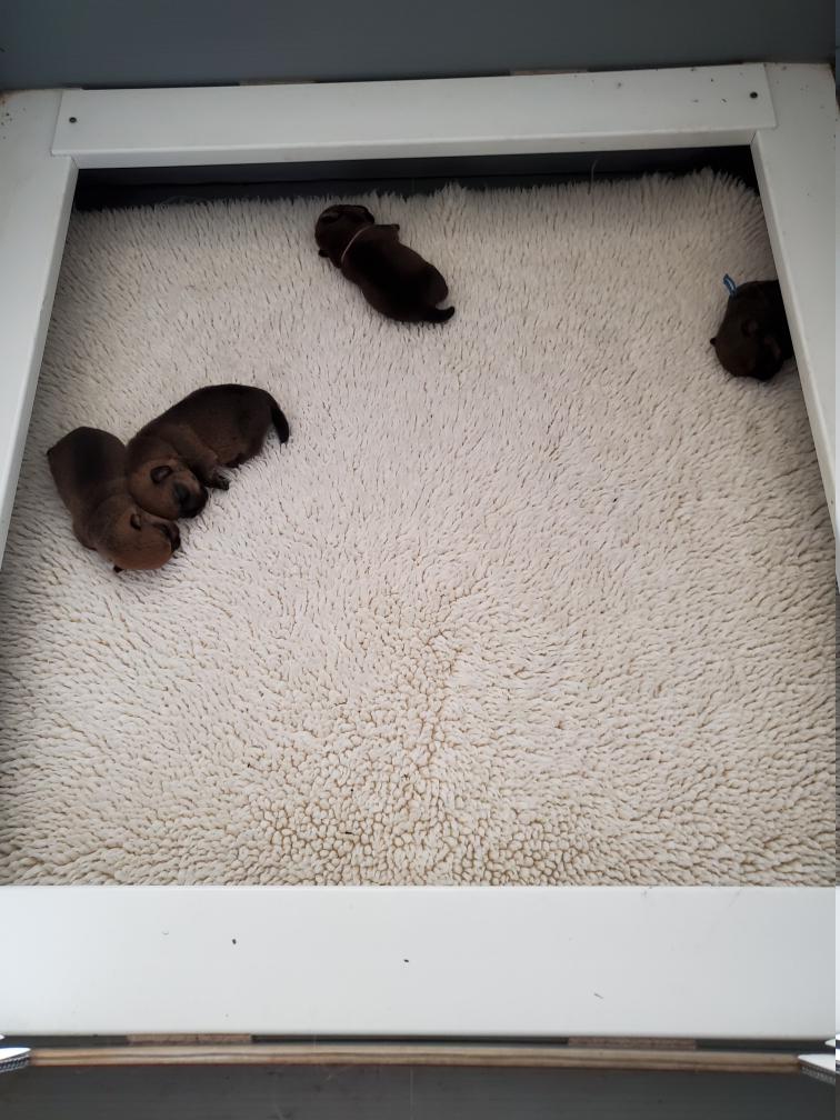 There was a little exploring of the play pen, but the puppies mostly slept ... and ate. Notice how there is really only room now for three puppies when nursing. Polly and Portia seem to be taking shifts feeding the puppies. All the puppies are gaining weight nicely. Catrin - still bringing up the rear - joined the 500 gram club today. But sleeping was still the major order of the day. Here are Catrin and Kate sleeping on the other side of the pen from Polly. Towards the end of the day, Mortimer went back into the crate to sleep. In the evening I returned the puppies to the whelping box for the night.