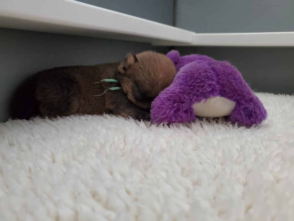 Besides twitching, the puppies will occasionally do a big stretch, then go back to sleep. Here is Green streching. Notice Green's left eye is open. I am continuing to apply the antibiotic to her left eye.