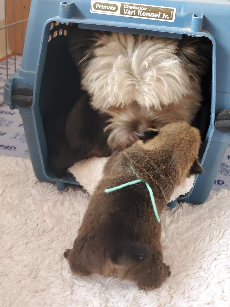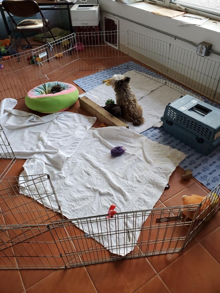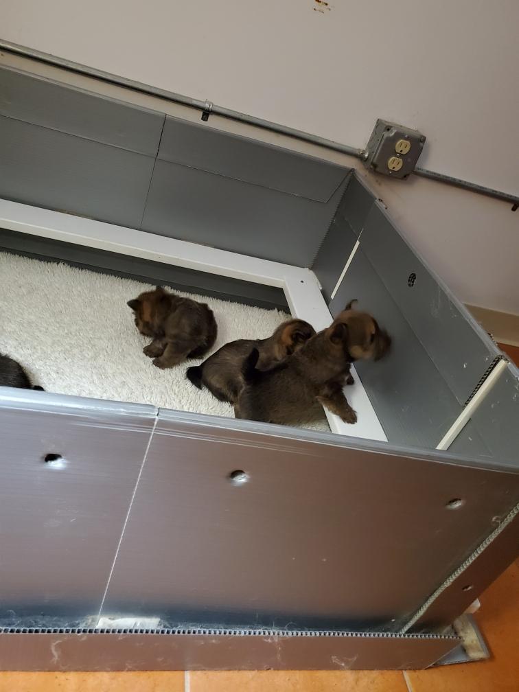 I moved the puppies out to the playpen in my living room for the day. There was much concern about this move from both Polly and Portia. At first the puppies did not want to come out of the crate. Or wanted back in, like Catrin here. And throughout the day, the puppies would occasionally realize that they were not in the whelping box and would sing out their displeasure at this change of venue.