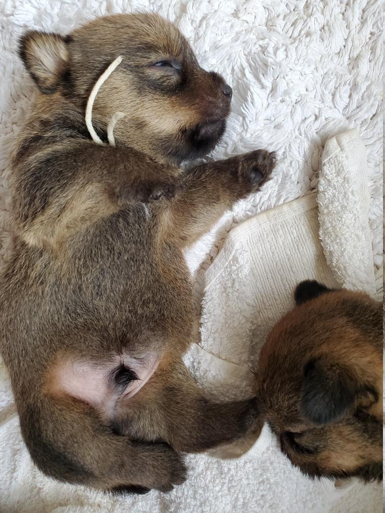 Green using her sister Pink as a pillow. Puppies are born blind and deaf, the only senses they have are feeling and smell. Their eyes open later (usually around ten to fourteen days after birth), and their ear canals open severals days after their eyes open.