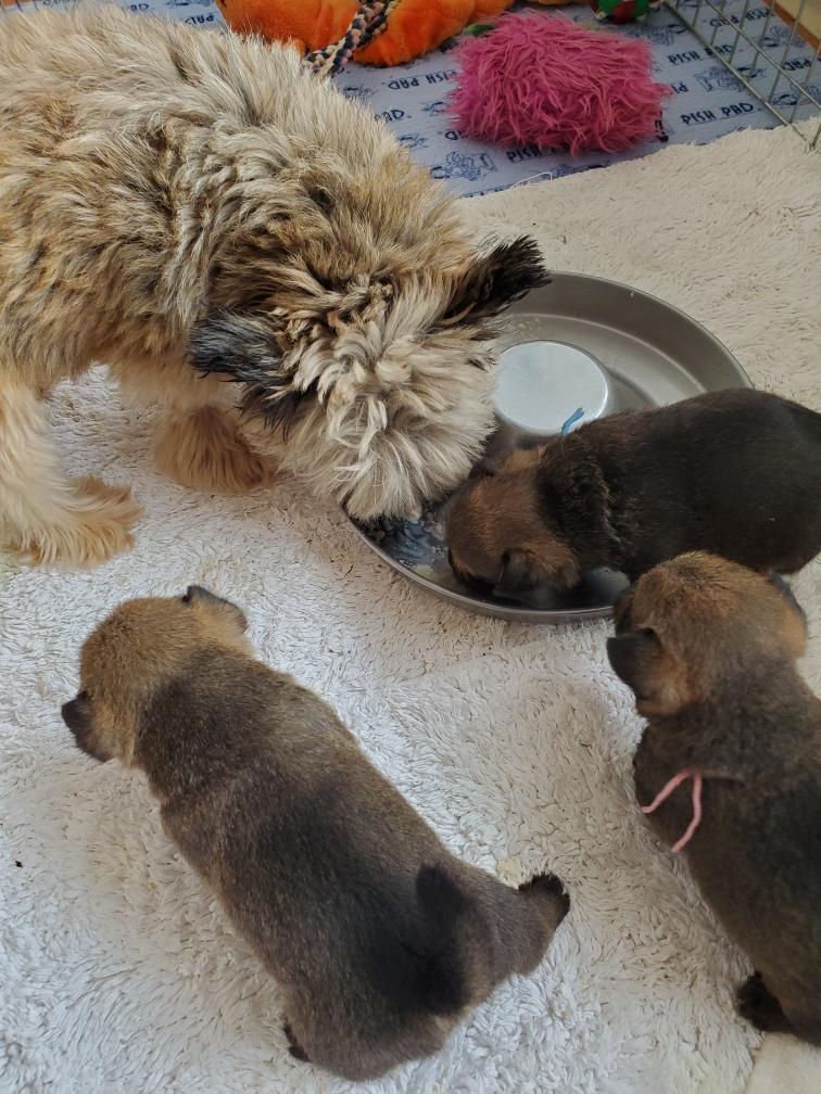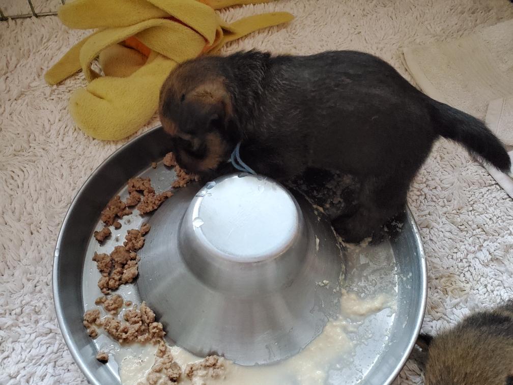 When Gwynie hardly touched her evening meal of "gruel", as an experiment I put the bowl in the whelping box with the puppies. The puppies thought this was a great present and cleaned the bowl! I have never had puppies so young interested in food.