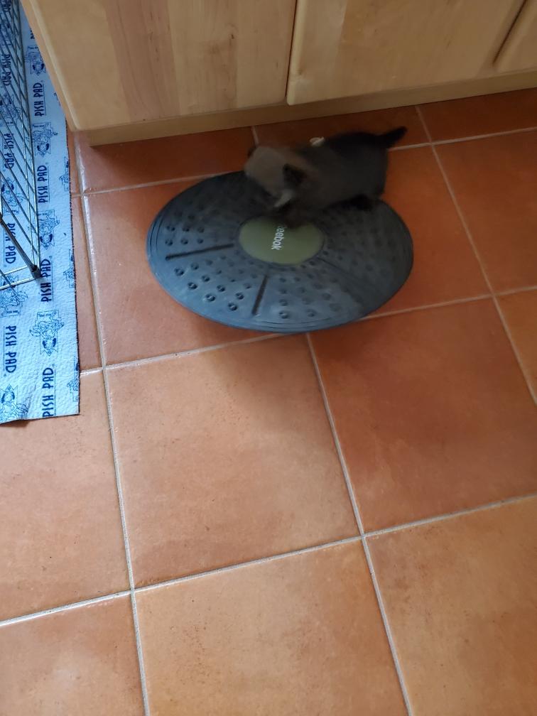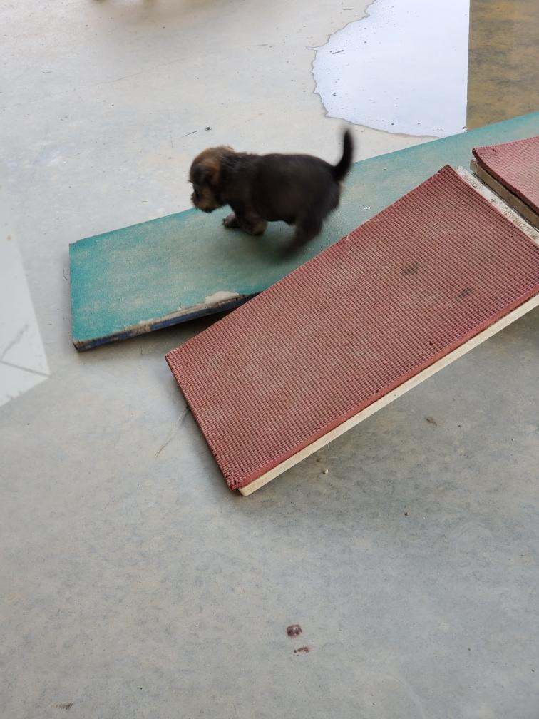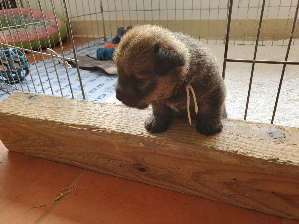 Hotspur is the first to climb over the wall (the wooden block) and get outside the playpen. Mortimer was a bit more cautious, but quickly followed. Both puppies were not sure what to do next and found my tile floor slippery. I put both back in the playpen. Hotspur took a long nap after his excursion.