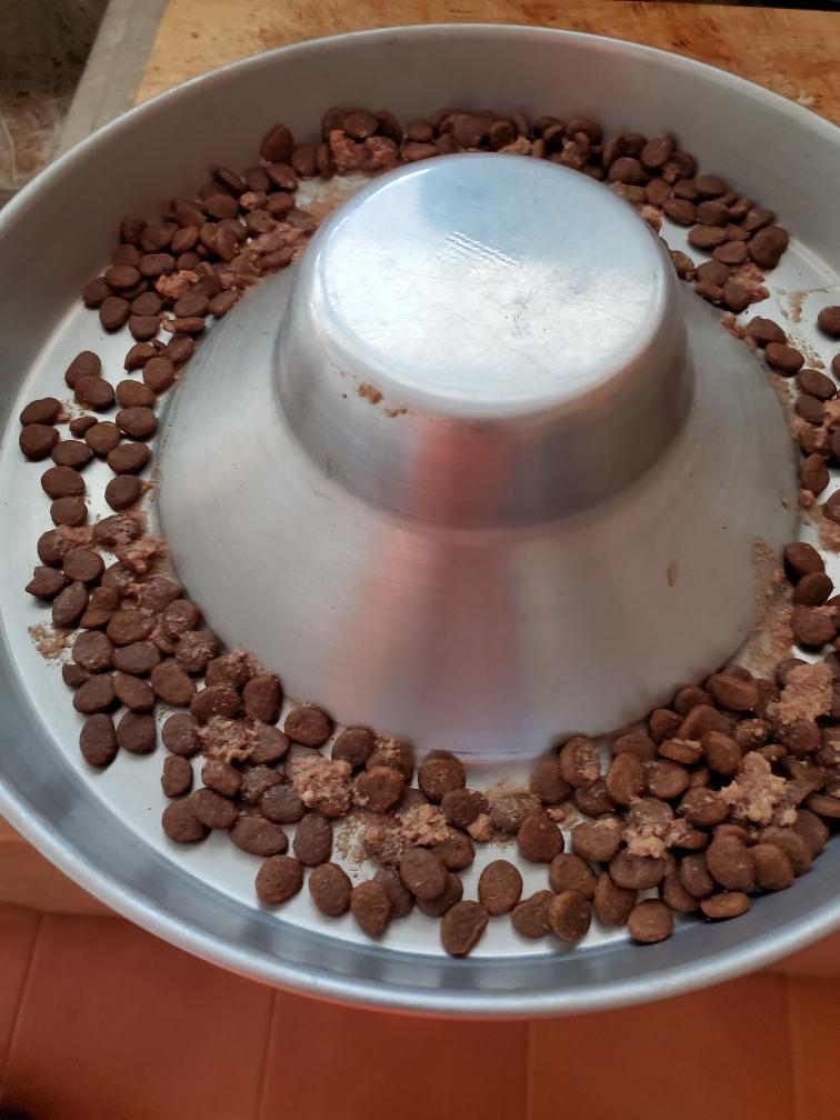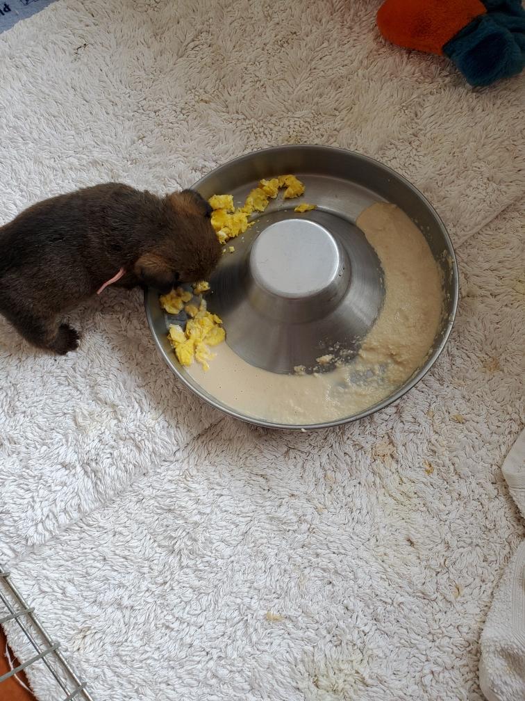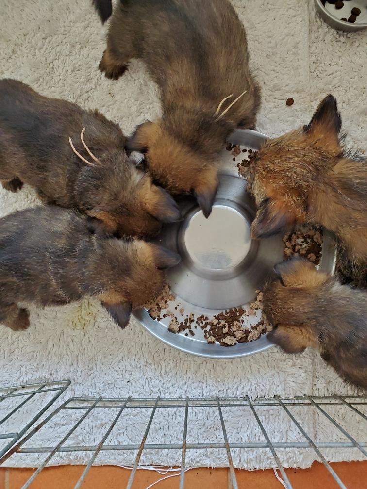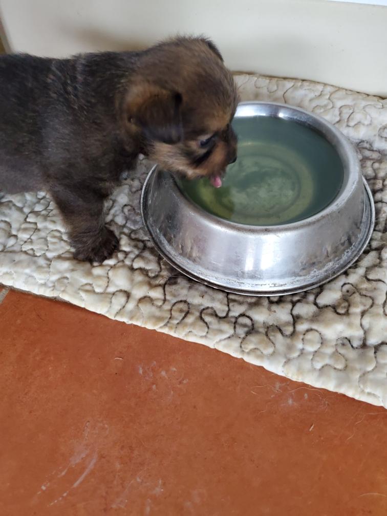 Note Catrin, who has fallen asleep in the feeding pan! The white specks are some baby rice that the puppies have gotten on them. Dinner was such a success that I fed the puppies another meal just before bedtime, which they gobbled down. So going forward I will feed the puppies four times a day.
