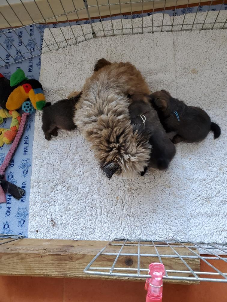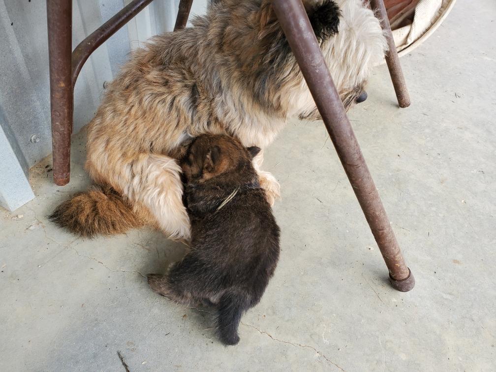 Polly nursing the puppies. It is getting crowded underneath Polly now that the puppies are getting bigger.