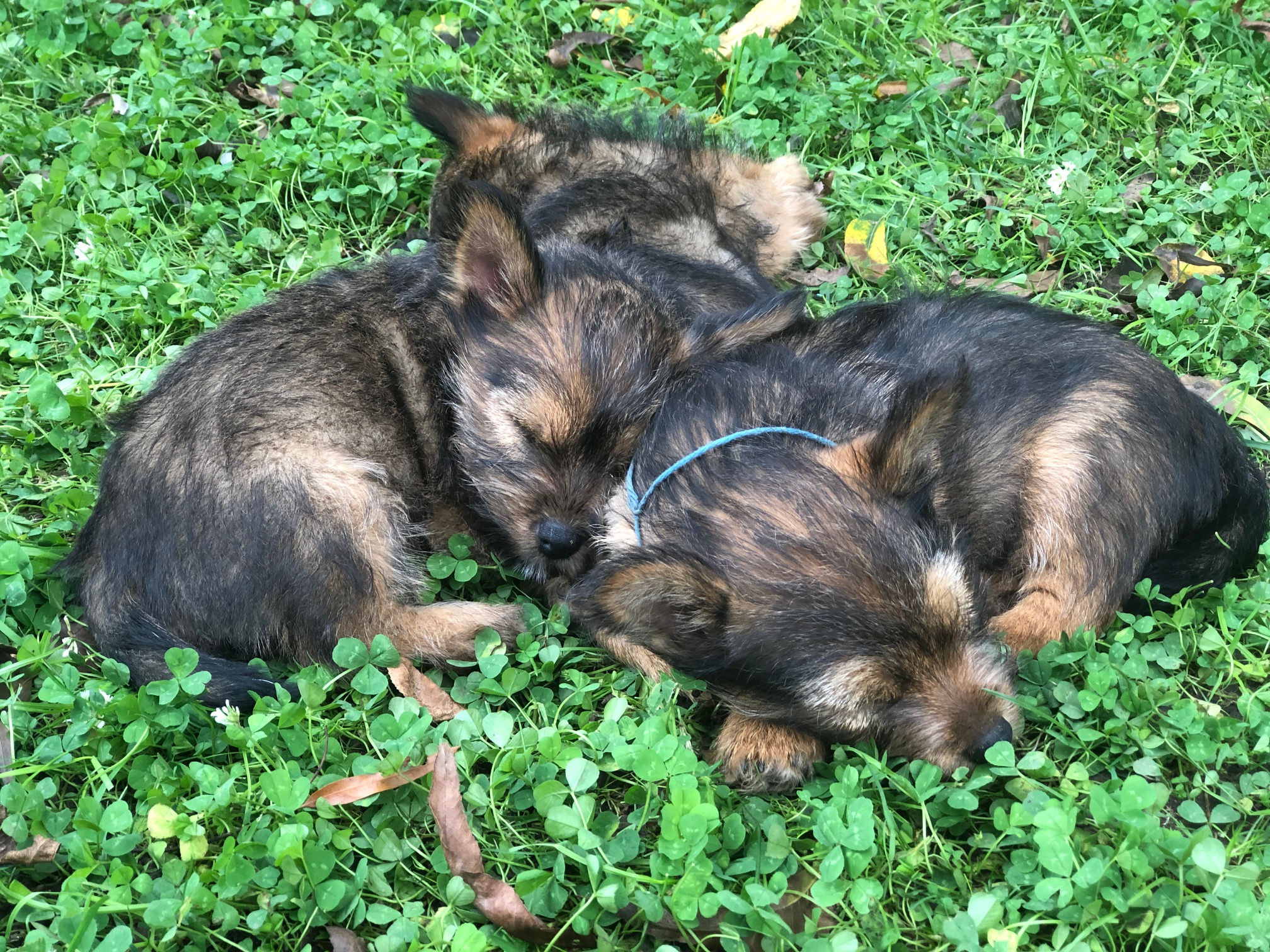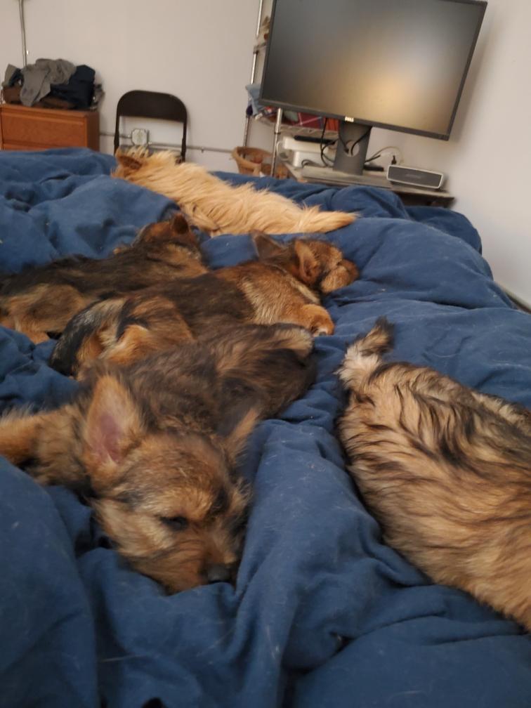 Eventually, Mortimer came out and joined the others. Here are the puppies sleeping in the North-South-East-West position.