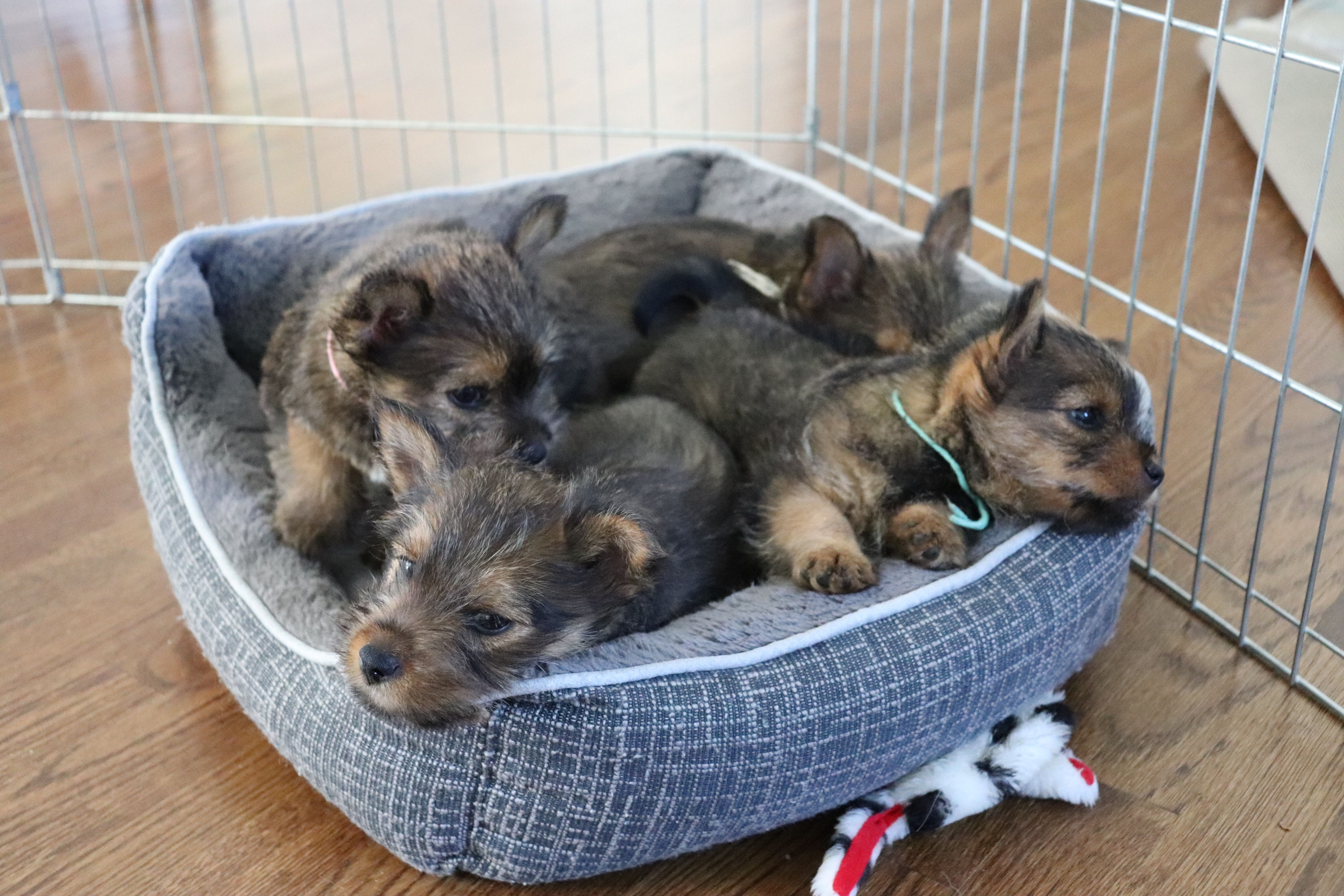 The puppies were in a nice arc. By the time I grabbed my camera, Blue (on the far left) had started to crawl towards Pink.