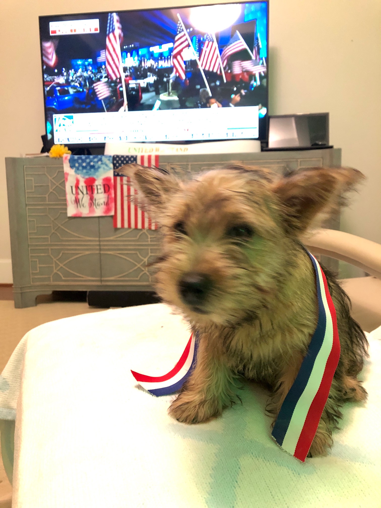 Polly has clearly put the puppies on a schedule (known only to her) and is spending more time during the day out in the living room with me. However if Polly hears a squeak from my bedroom, she immediately rushes back to check on the puppies. Here is Polly admiring herself in a mirrow.
