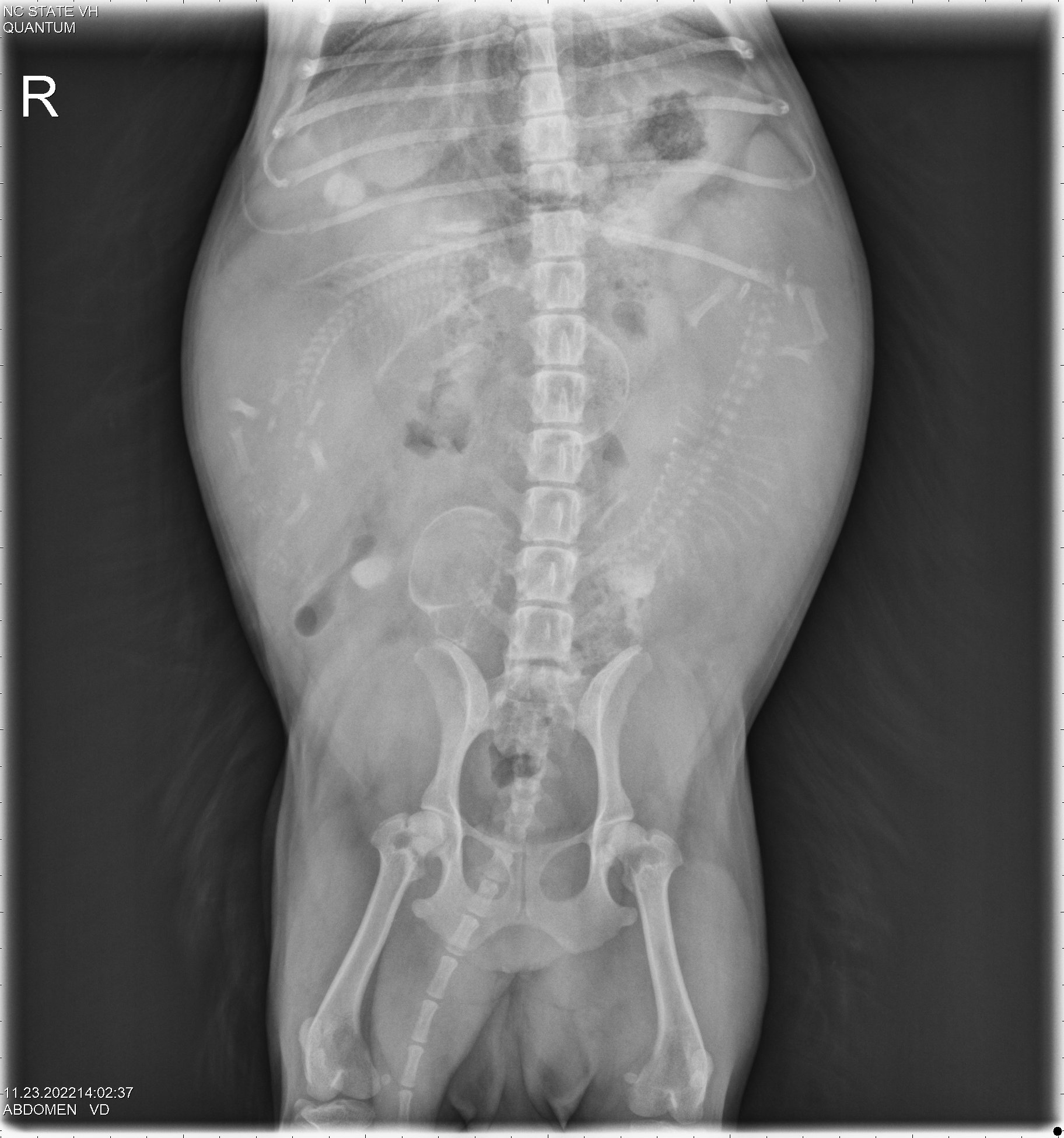 By measuring the size of the puppies' skulls and the width of Siri's pelvic opening, it was determined that the puppies should be able to fit through Siri's pelvis. Thus Siri might be able to have the puppies naturally (free-whelp), rather than needing a cesarean section (c-section). The rule of thumb is that if there is only one puppy, a c-section is almost always necessary; whereas if there are three or more puppies, one should try to free-whelp. If there are only two puppies, it is not clear what to do.