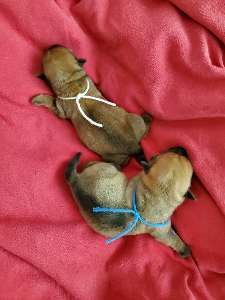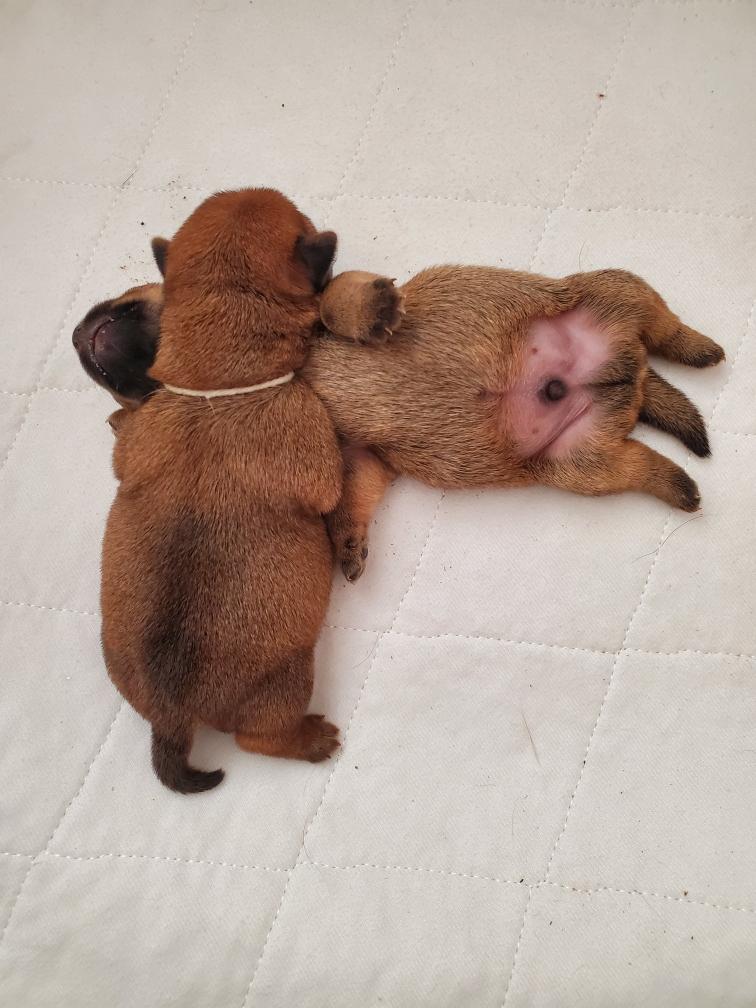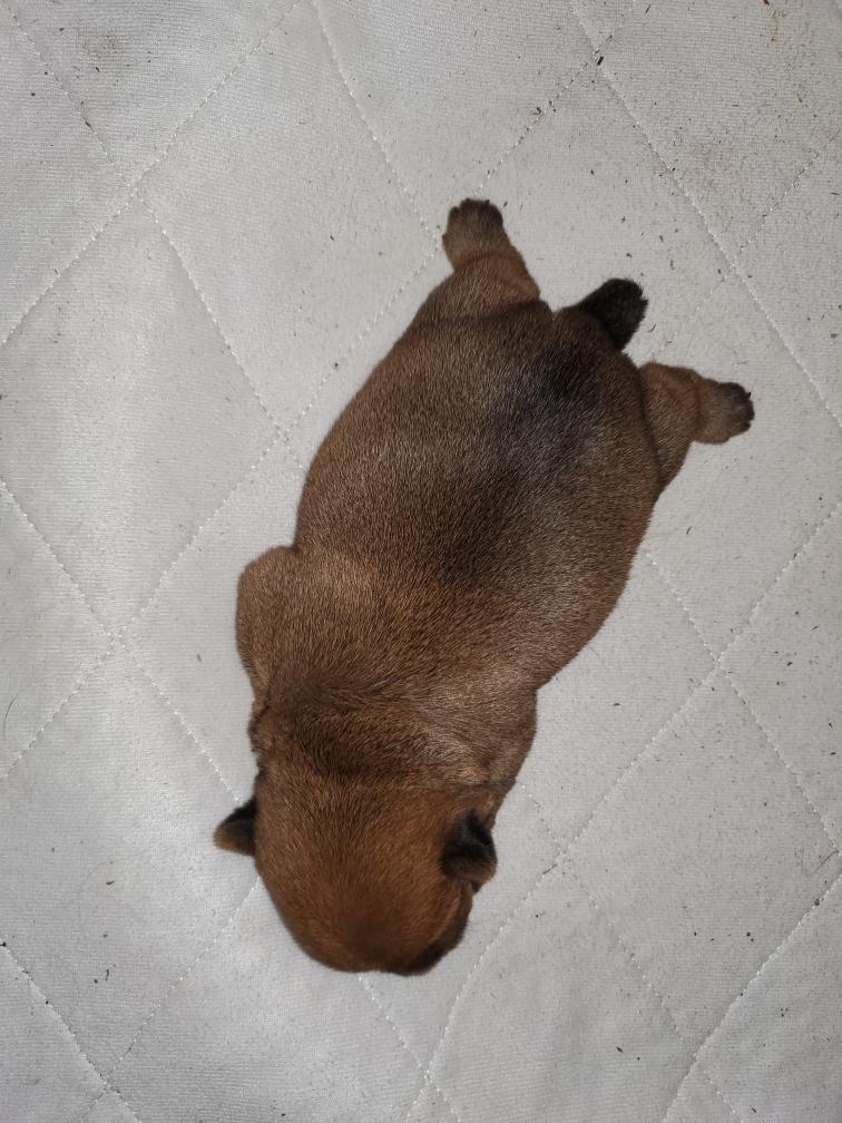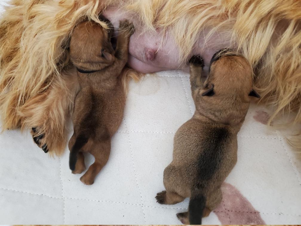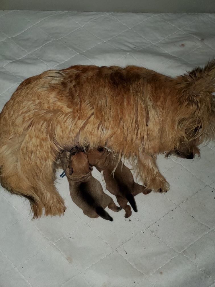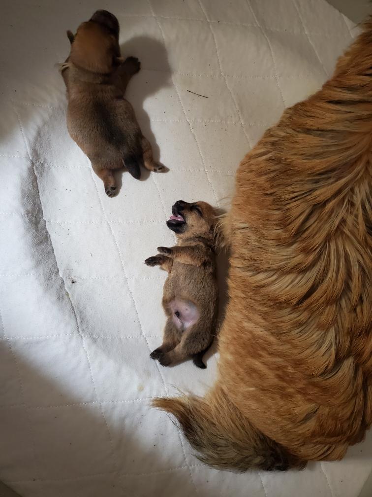 Mostly Siri has the puppies tucked underneath. I only getting a good look at the puppies when Siri goes outside to potty. The puppies are starting to loose that wrinkly look that newborns have.