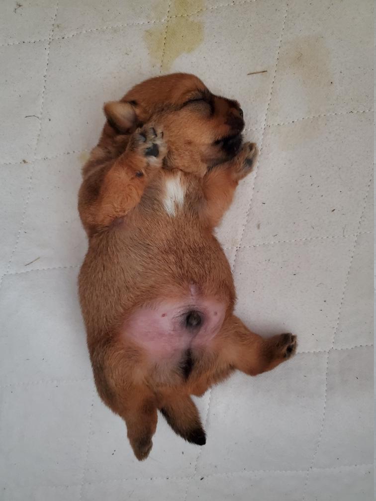 Chang sleeping on his back. And later sleeping on his back next to his toys. Note the stain to the right of the toys. Mommy Siri does a good job of keeping her puppy clean. But sometime Siri is not around when Chang has to pee. I change and wash the bedding in the whelping box every day.