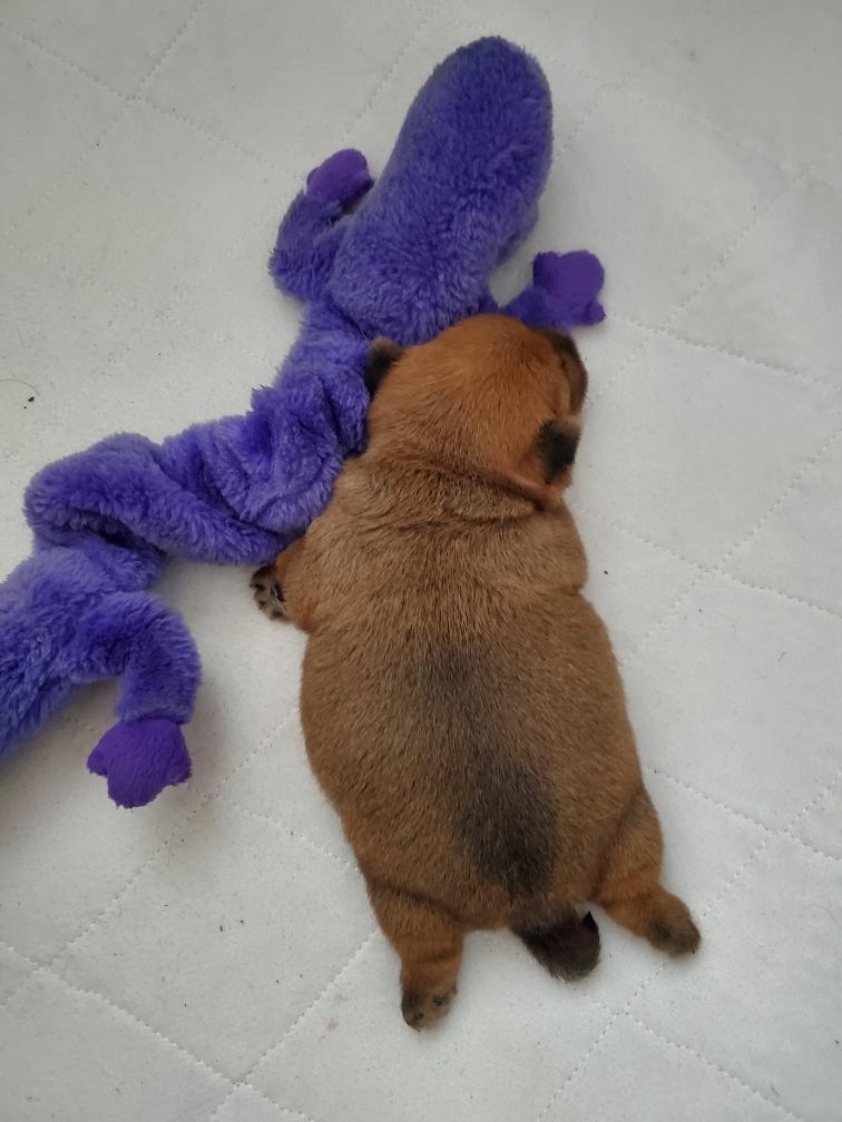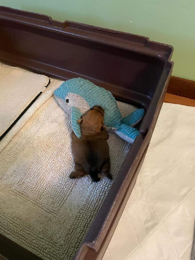 I put a plush toy in the whelping box with White. I did this mostly to give his eyes something to focus on during those rare moments when he wakes up and opens his eyes. White has never seemed very interested in sleeping next to something. I suspect the warmth of the whelping nest is all that he really wants.