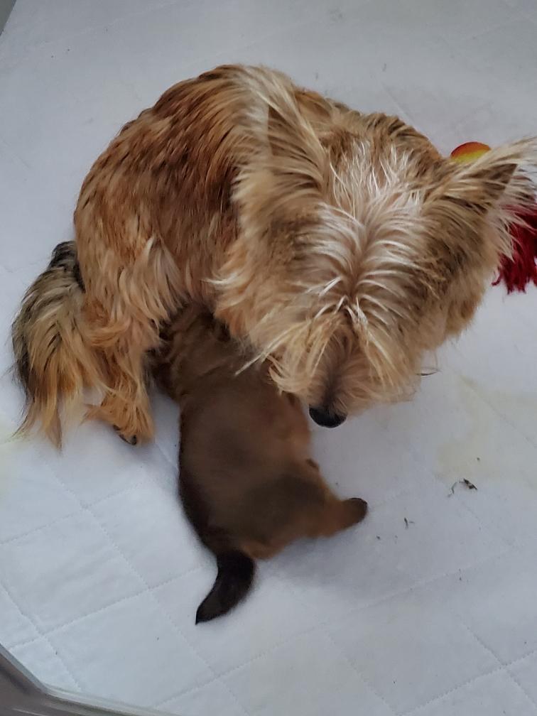 Siri cleaning White. If you look closely, you can see the red of Siri's tongue. Newborn puppies can not pee or poop on their own. The mother has to stimulate by licking the puppy to get the puppy to pee or poop. The mother than drinks the pee and eats the poop to keep the nest clean.