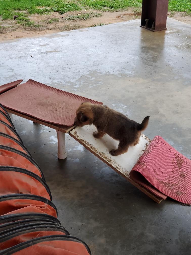 After (almost) conquering the baby dogwalk on my porch, today Chang showed that he can do my baby teeter. Chang also went into my baby tunnel, but after exploring a short way turned around and came back out.