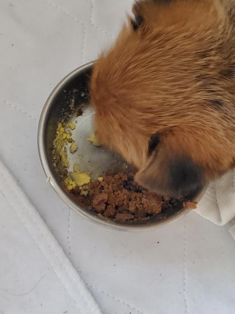 For dinner, my adult dogs got some hard-boiled egg on top of their kibble. I gave Chang the yolk from one egg. Chang thought the yolk was a great treat.