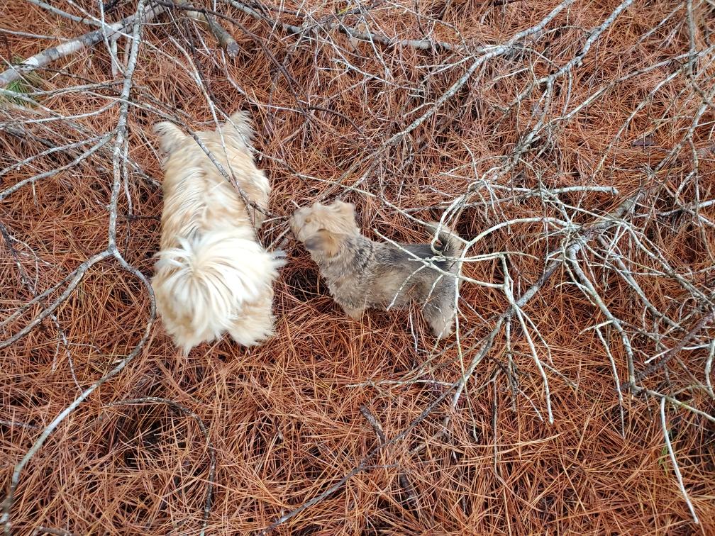 Mommy Siri has White on some kind of feeding schedule (known only to Siri). For the past couple of days Siri has come with me and the other dogs for our daily walk in the woods. Usually Siri either turns back early or runs ahead ... and greets us when the rest of us get home. Being hunting season, the hunters were out in force today with their hunting dogs. This always causes lots of barking by my dogs, as they protect their area and warn the hunting dogs to stay away. Instead of coming with us on our daily walk today, Siri stuck close to home to make sure no one harmed her puppy.
