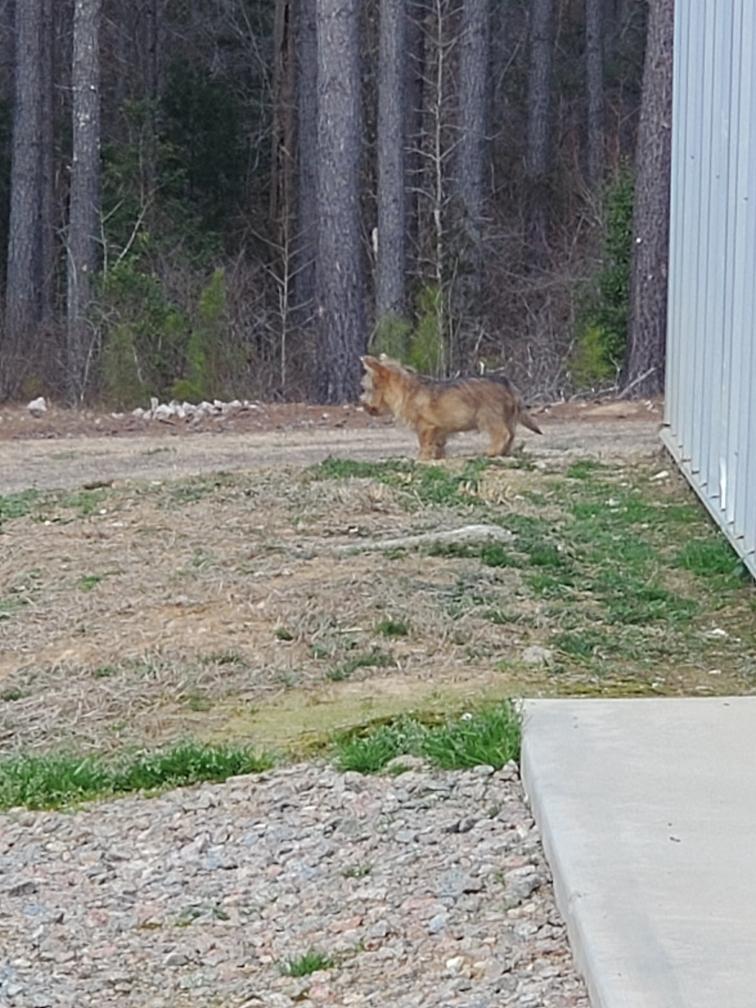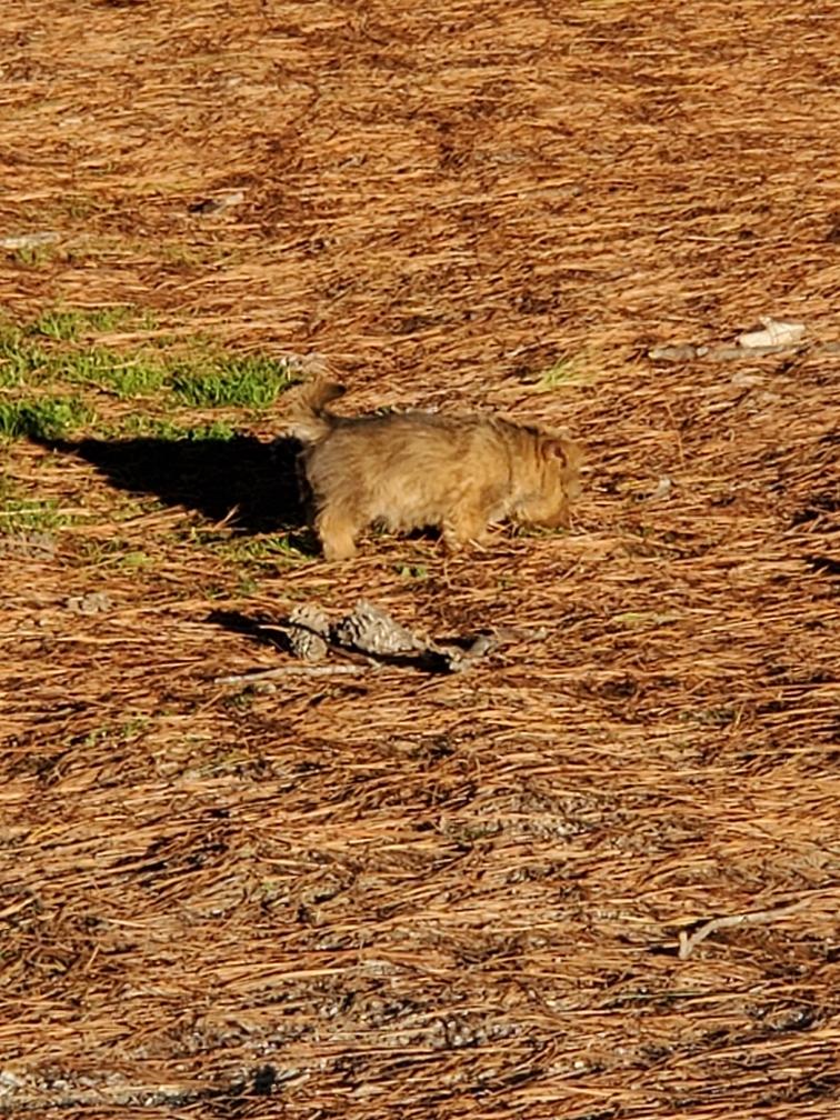 Chang (in the distance) exploring my gravel driveway. Chang turned around after I took this picture, probably figuring that he had gone far enough away from my house.